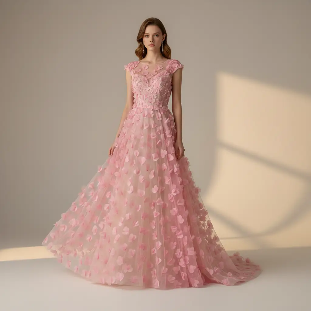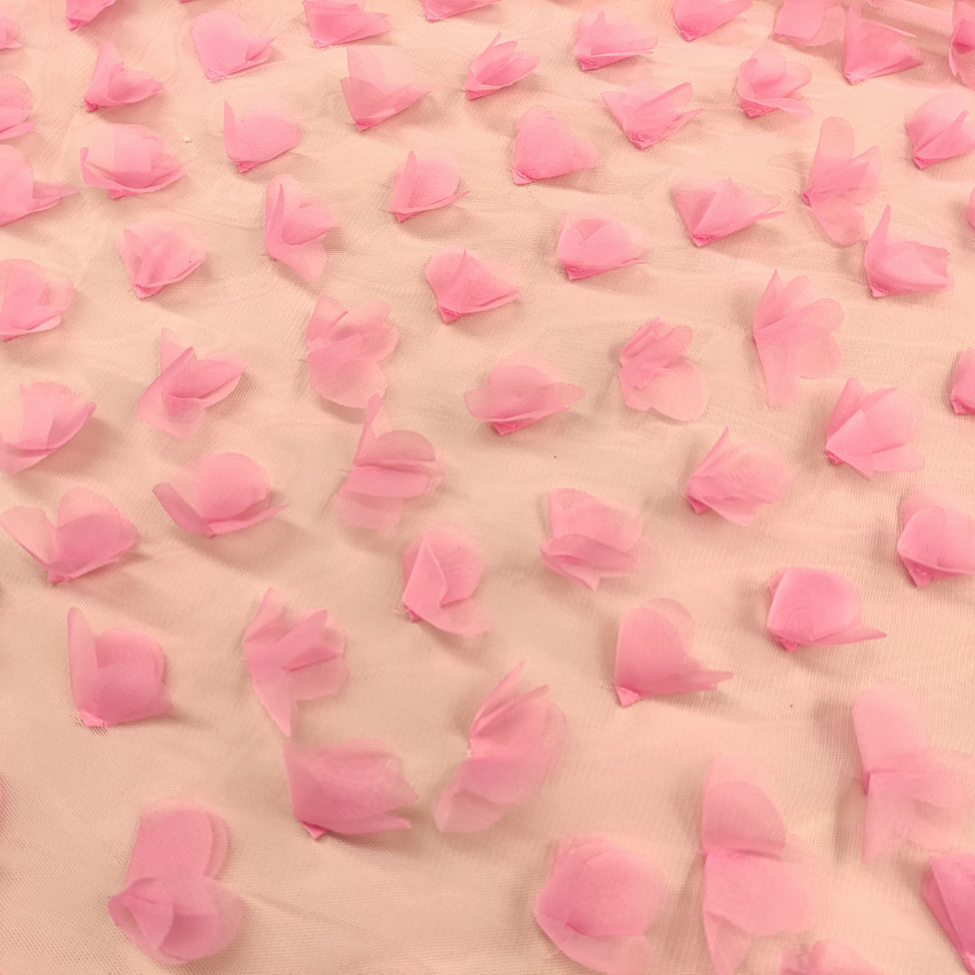 Tessuto Tulle mano seta ricamato con petali in 3D rosa baby