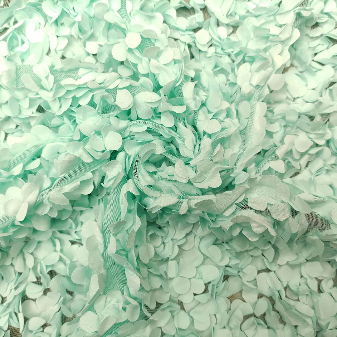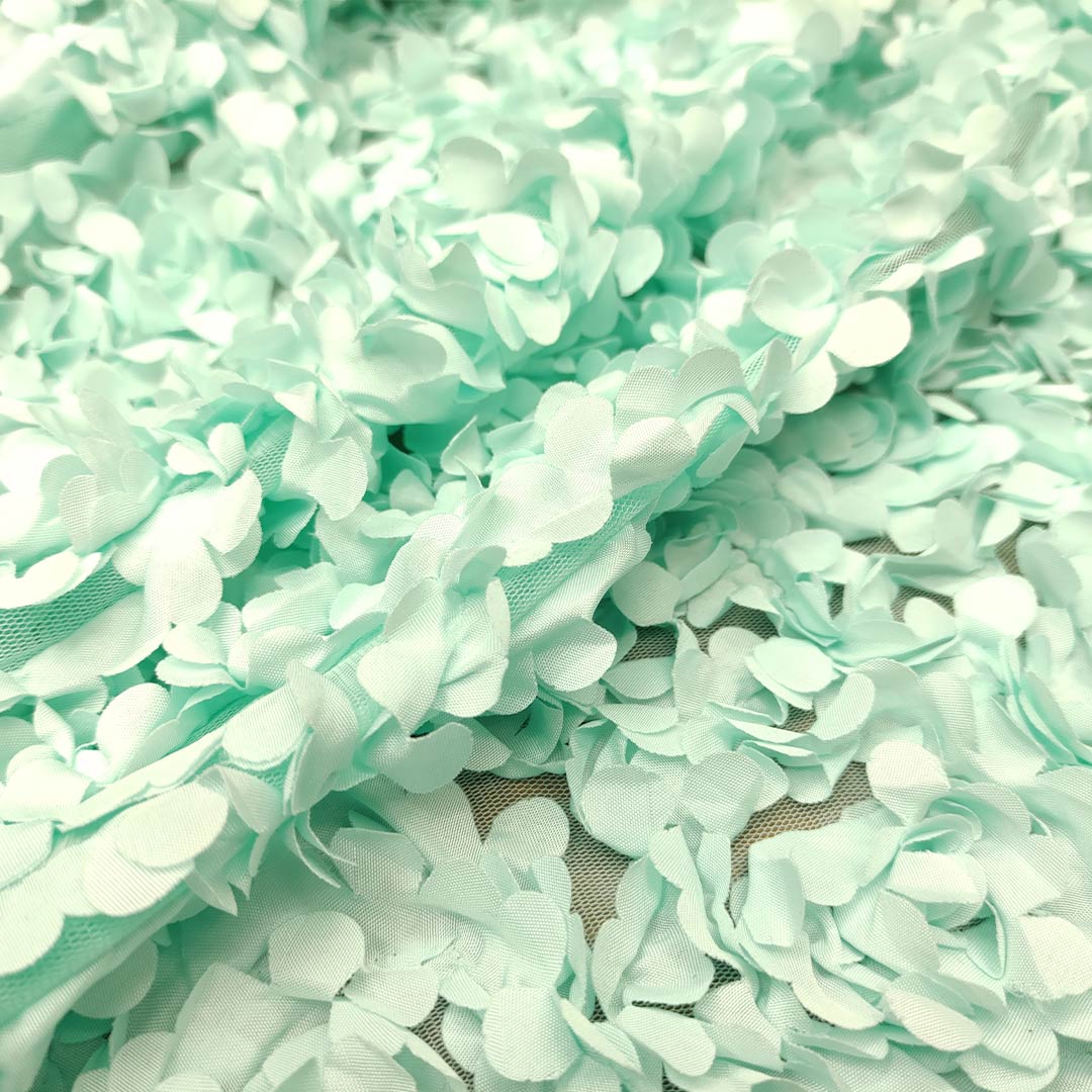 Tessuto Tulle mano seta ricamato con petali 3D dalla mano morbida, voluminosa e fluente, ideale per creare capi sartoriali da cerimonia e per le grandi occasioni originali e alla moda.