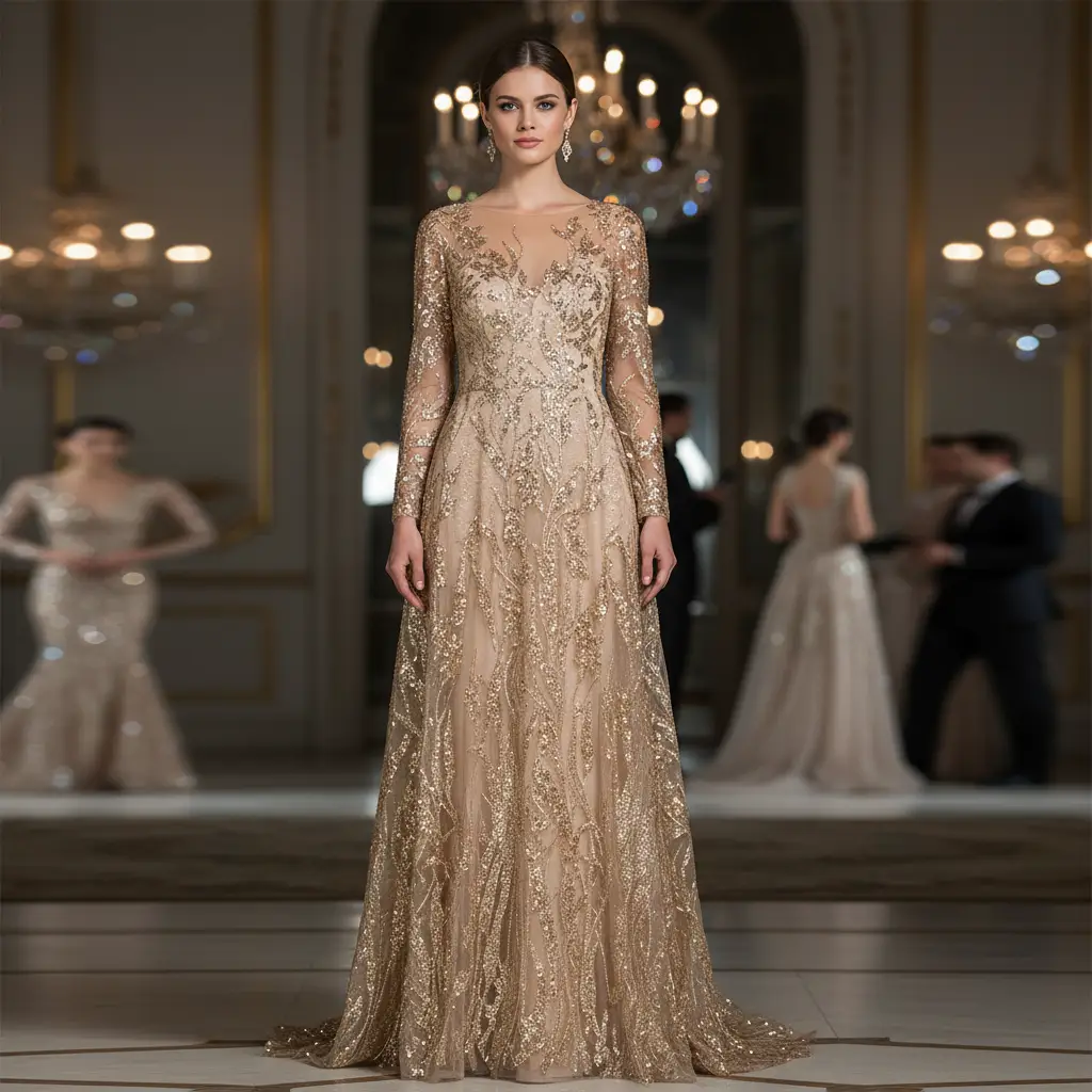 Tessuto Tulle mano seta ricamato con pietre e con paillettes, ideale per realizzare capi da cerimonia esclusivi ed eleganti.