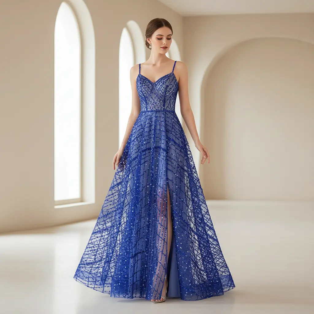 Tessuto tulle mano seta ricamato con pietre – con perle – con paillettes motivo astratto blu elettrico