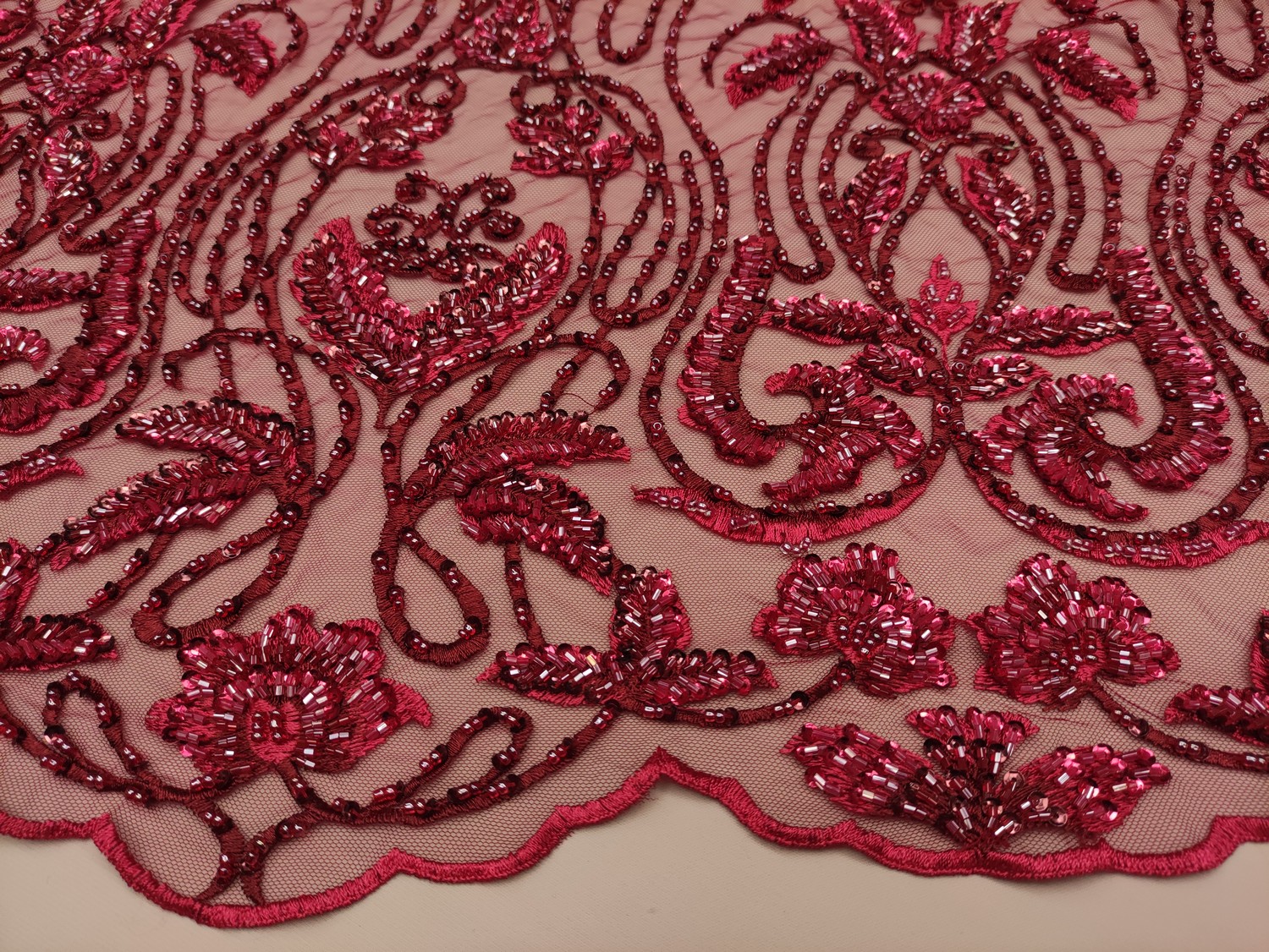Tessuto tulle mano seta ricamato con pietre – con perle – con paillettes motivo floreale barocco bordeaux
