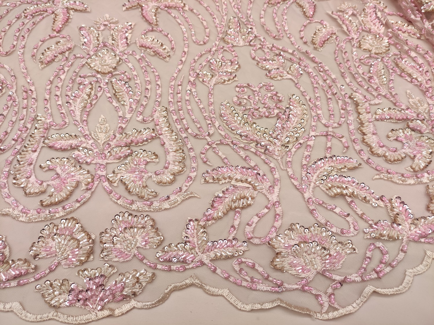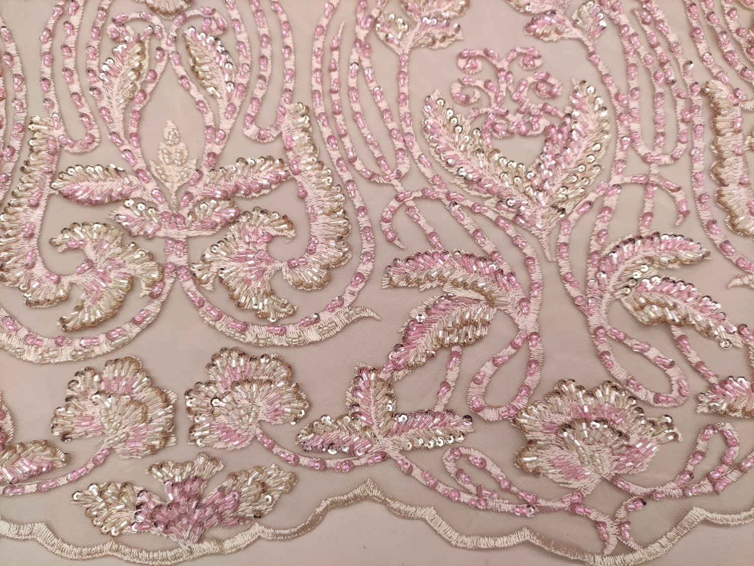 Tessuto tulle mano seta ricamato con pietre – con perle – con paillettes motivo floreale barocco rosa – beige