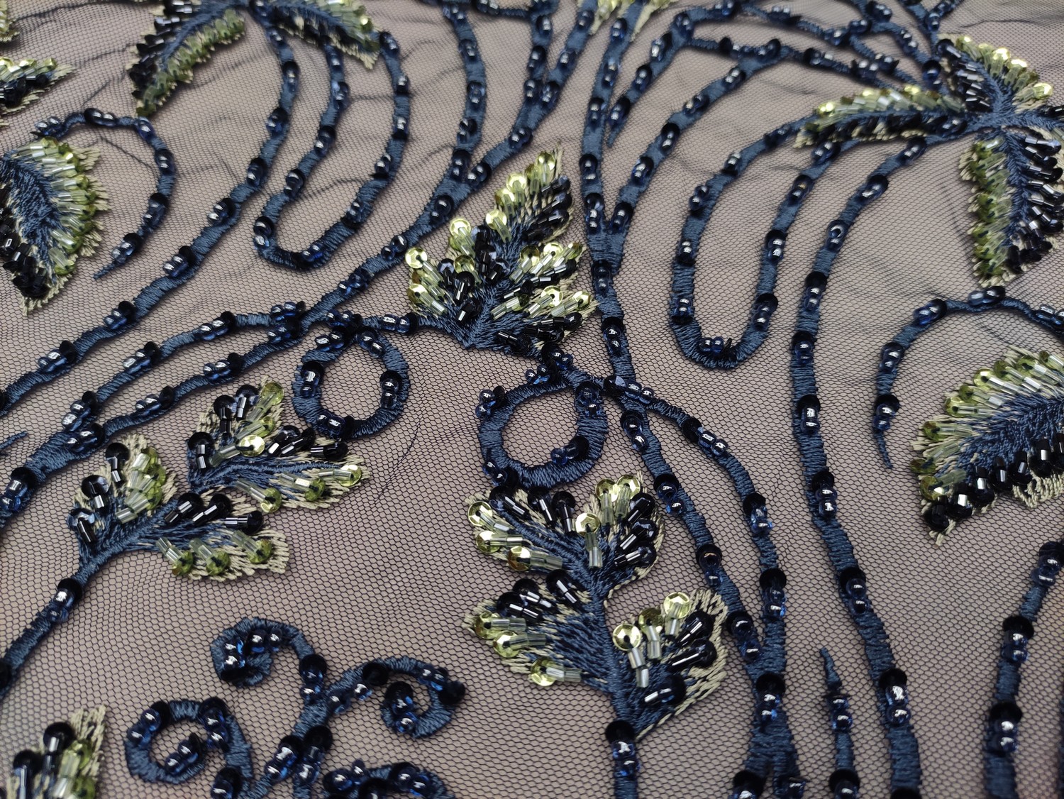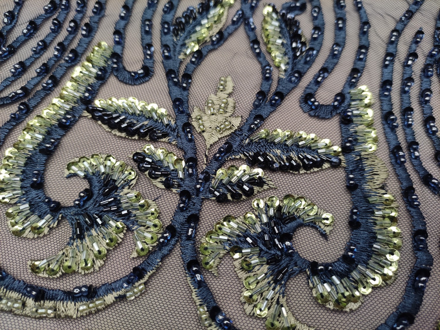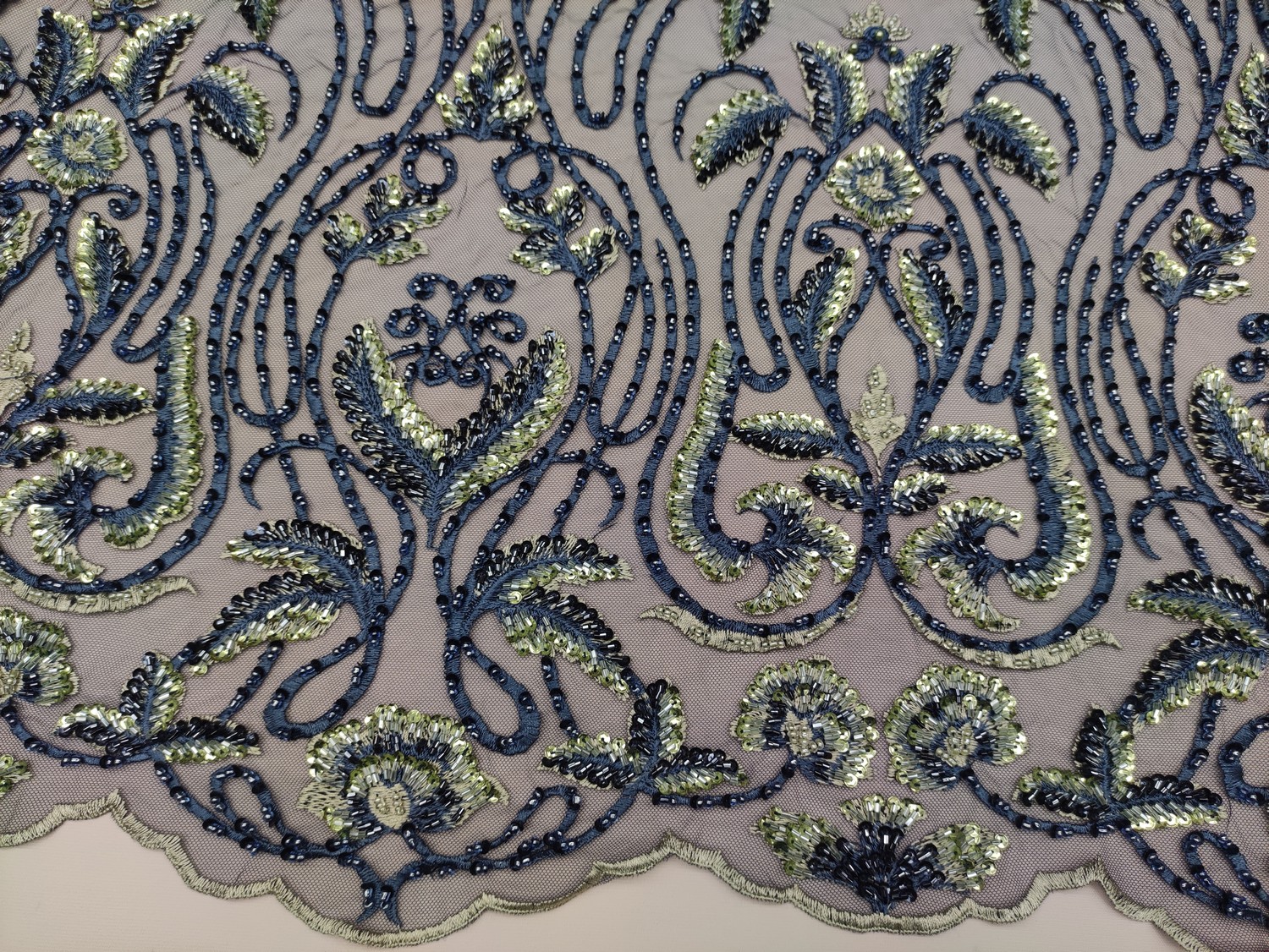 Tessuto tulle mano seta ricamato con pietre – con perle – con paillettes motivo floreale barocco verde – blu