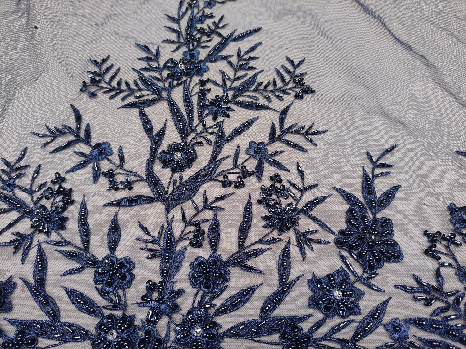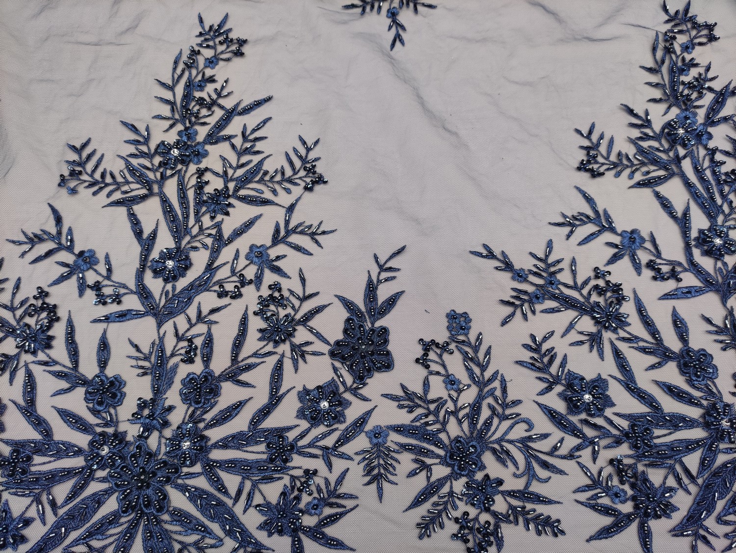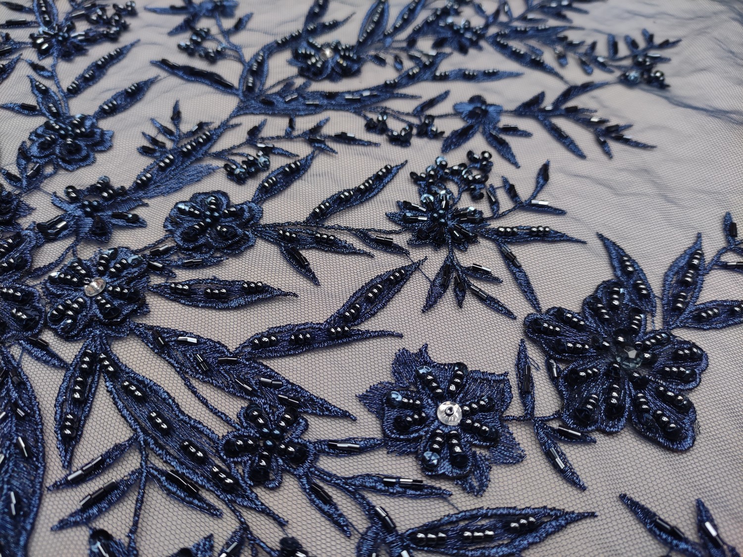 Tessuto tulle mano seta ricamato con pietre – con perle – con paillettes motivo floreale blu
