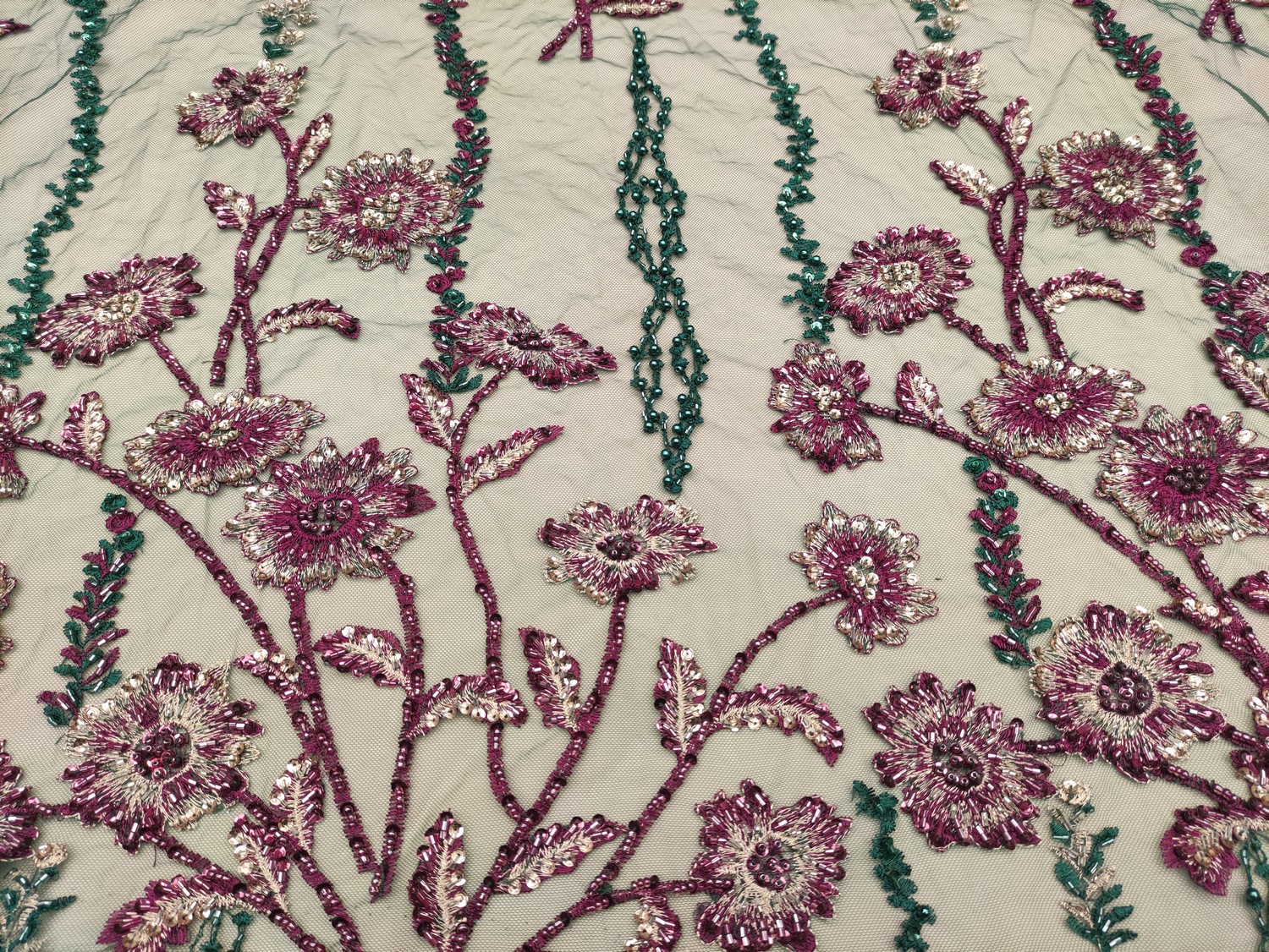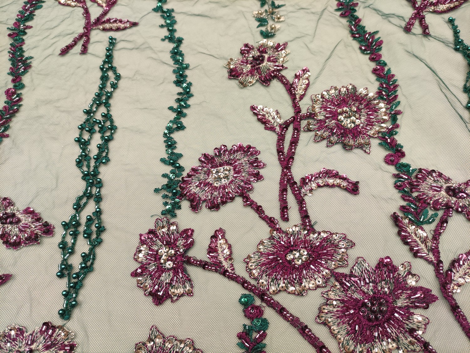 Tessuto tulle mano seta ricamato con pietre – con perle – con paillettes motivo floreale vinaccio – verde – oro
