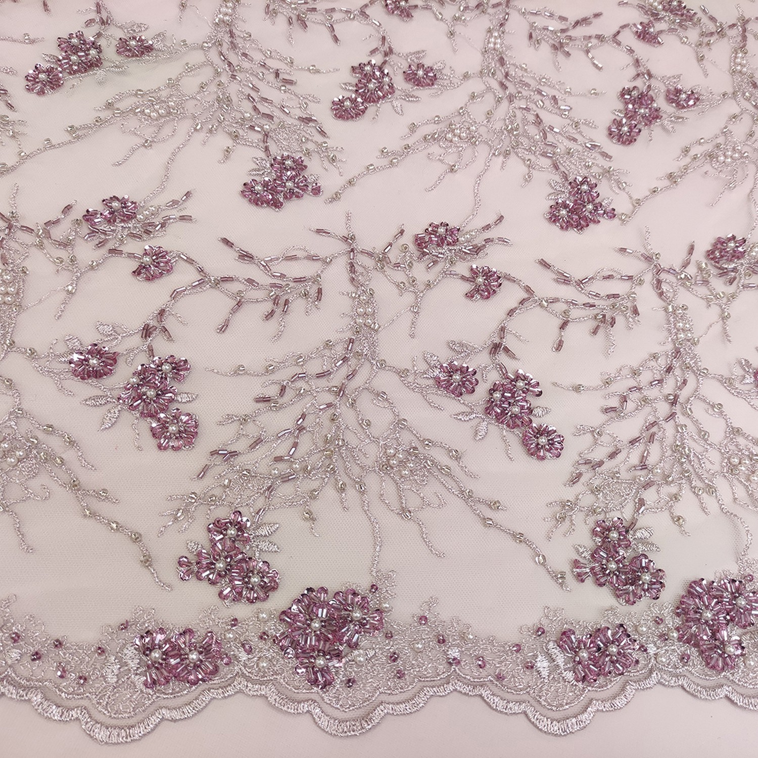 Tessuto tulle mano seta ricamato con pietre – con perle motivo floreale rosa chiaro – rosa scuro