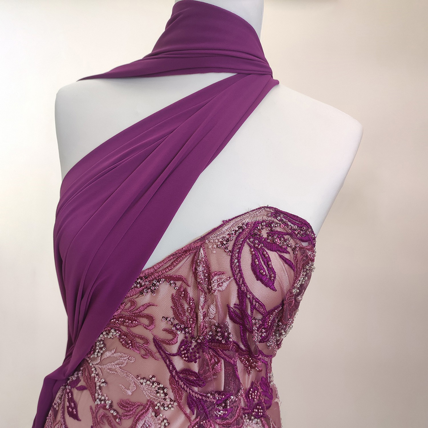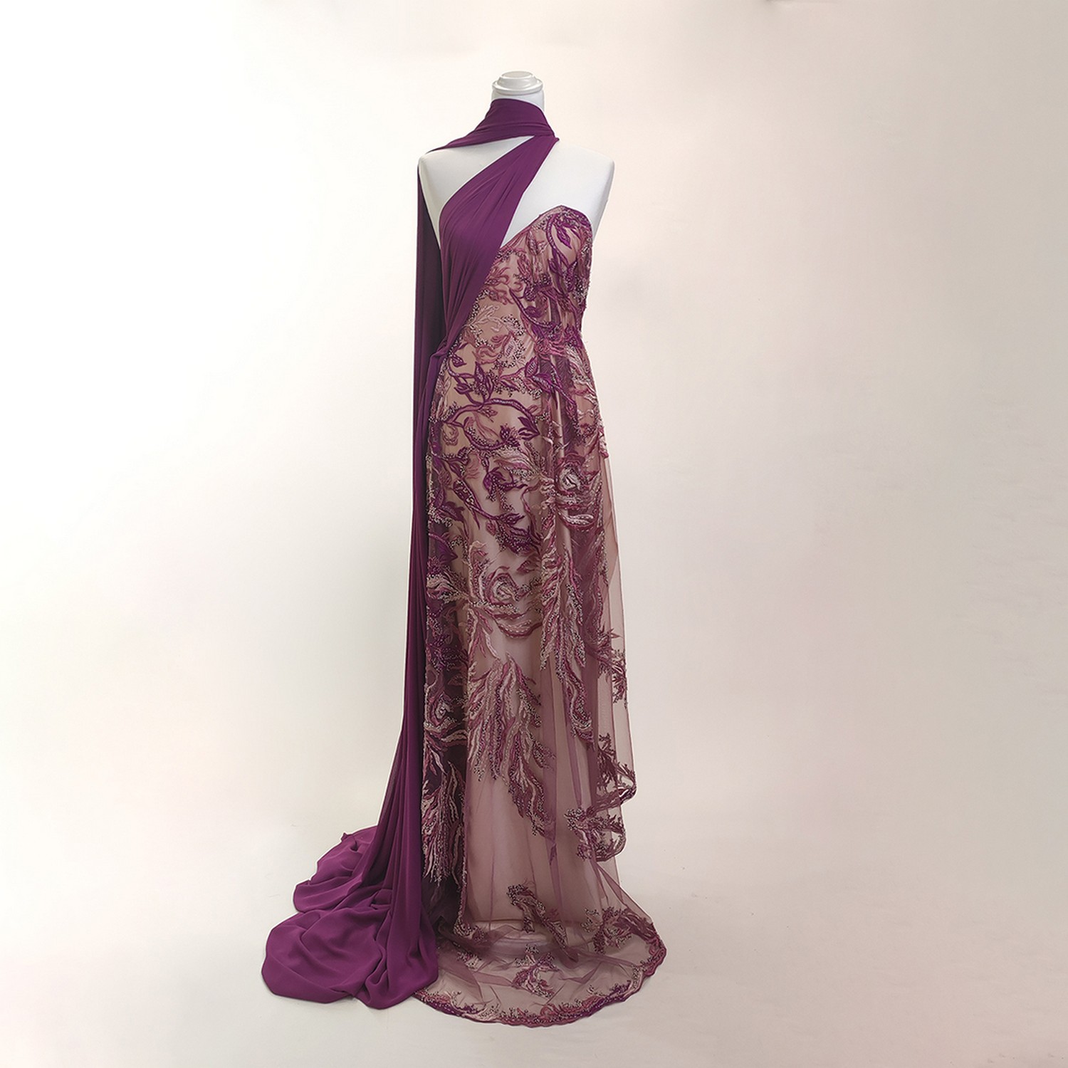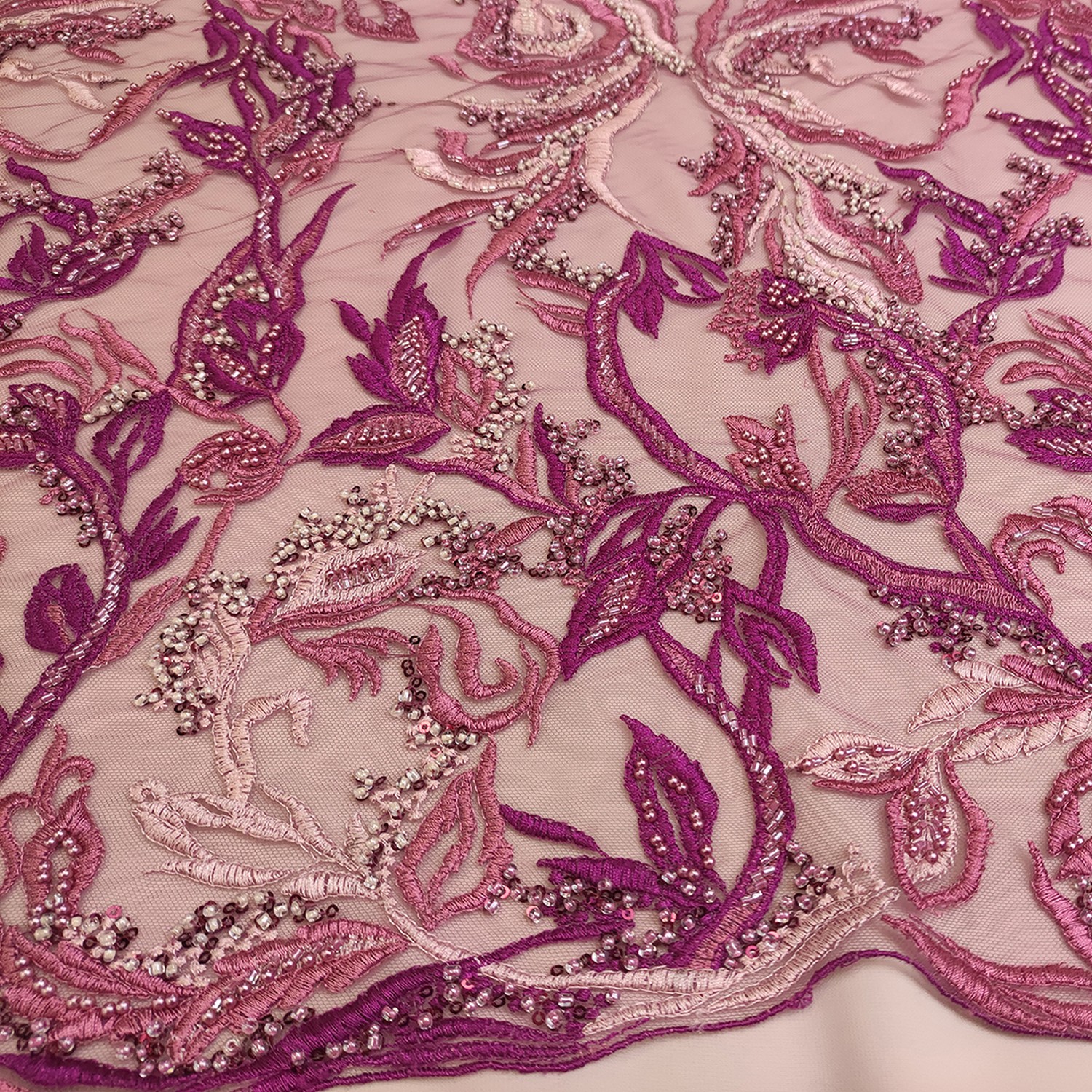 Tessuto tulle mano seta ricamato con pietre – con perle motivo floreale vinaccio – rosa scuro