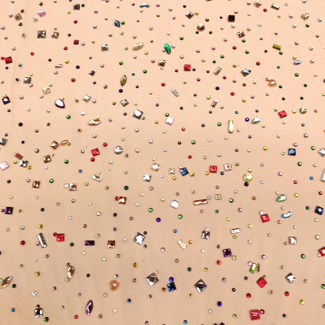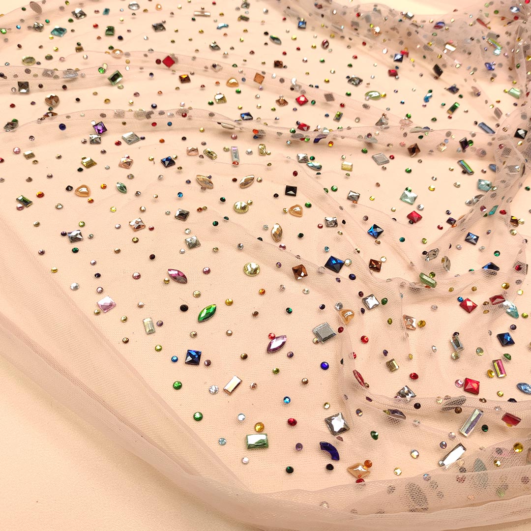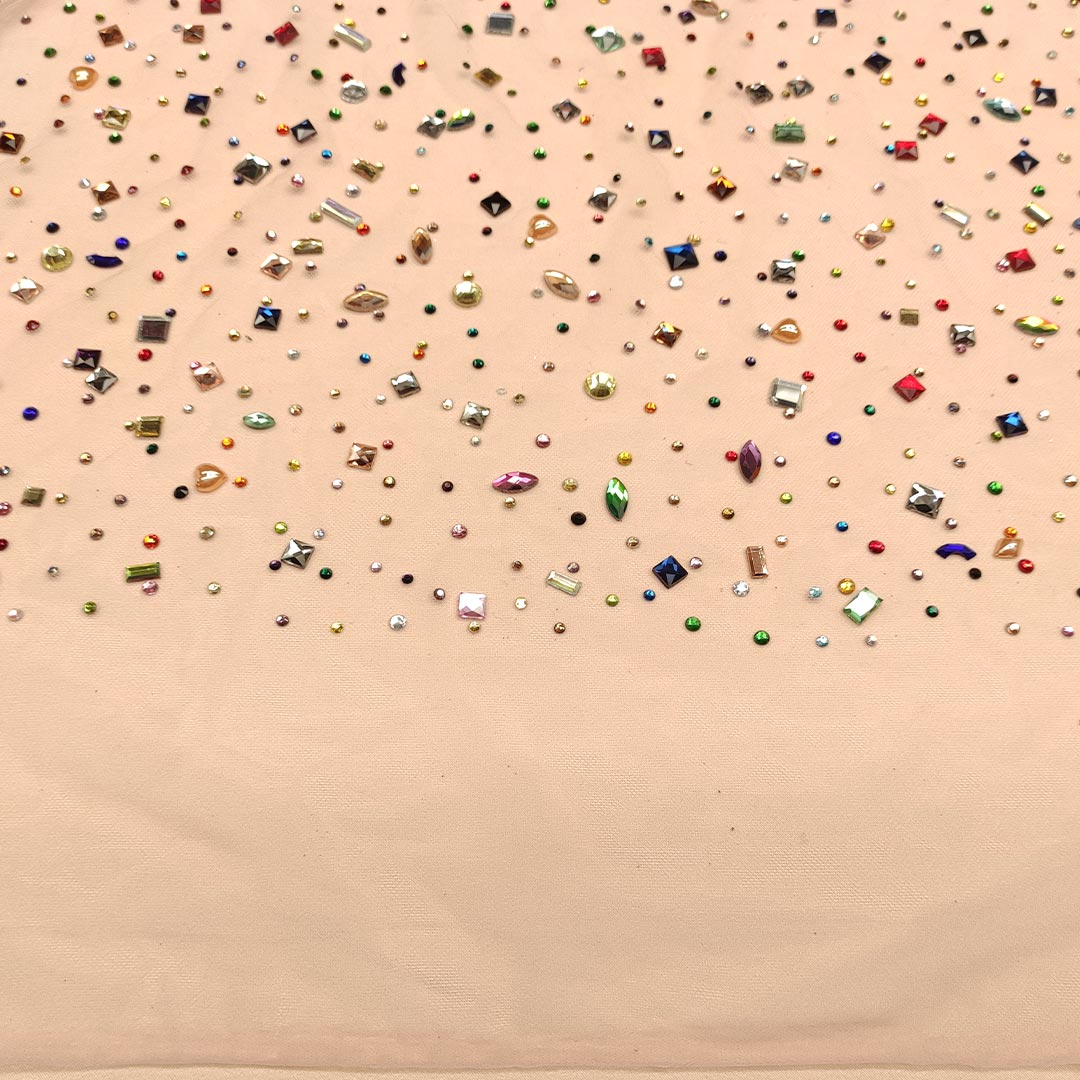Tessuto Tulle mano seta ricamato con pietre e con strass ideale per realizzare capi da cerimonia esclusivi ed eleganti.