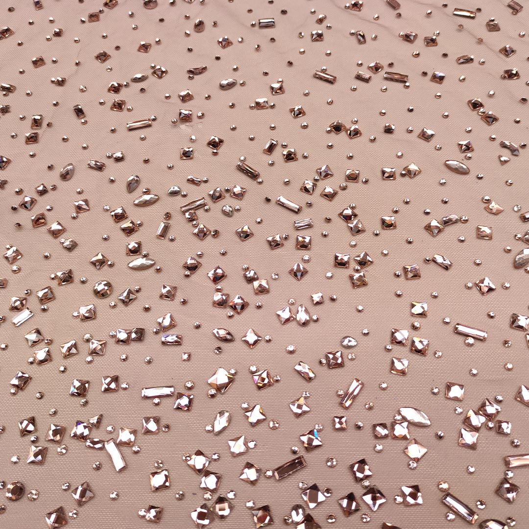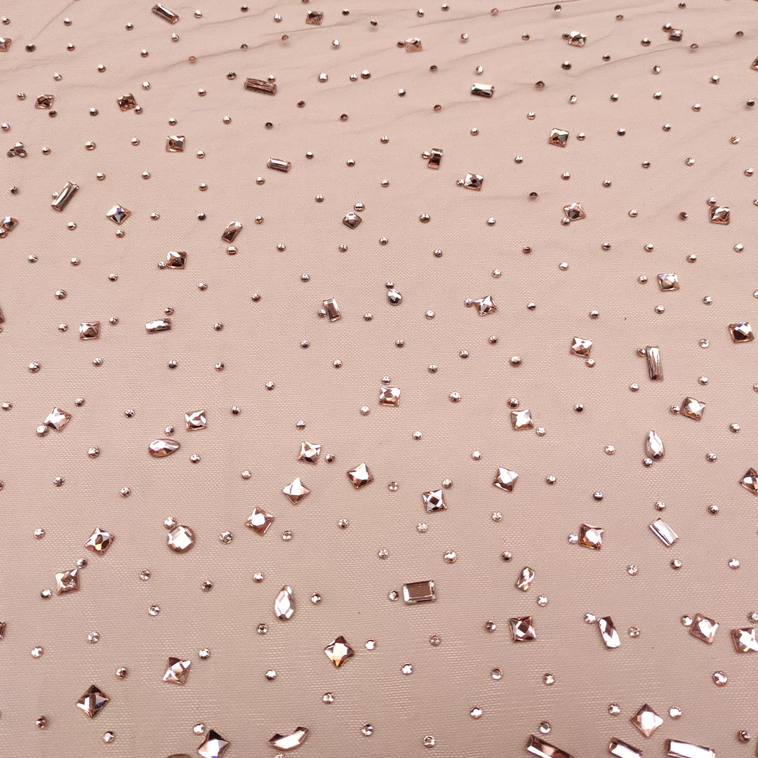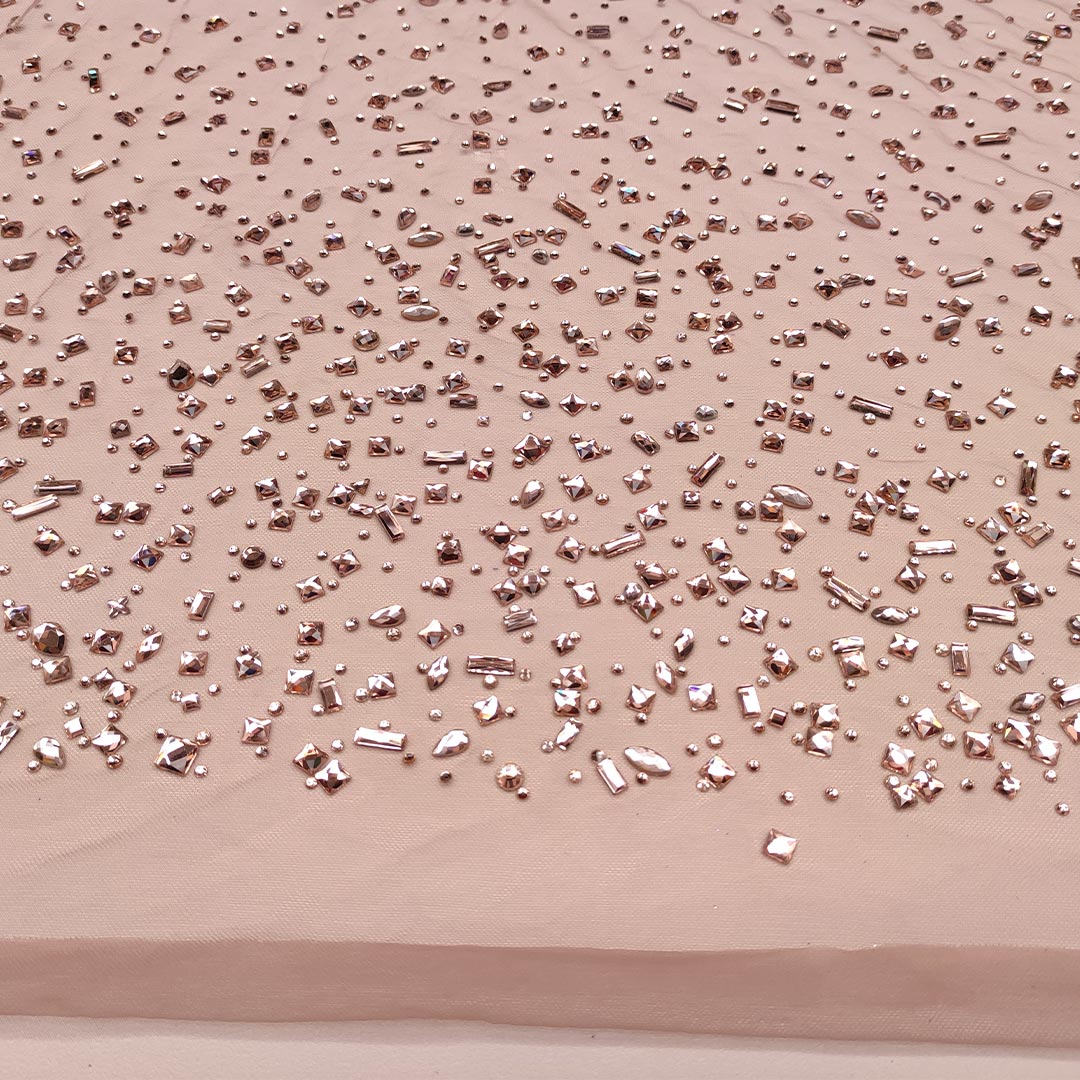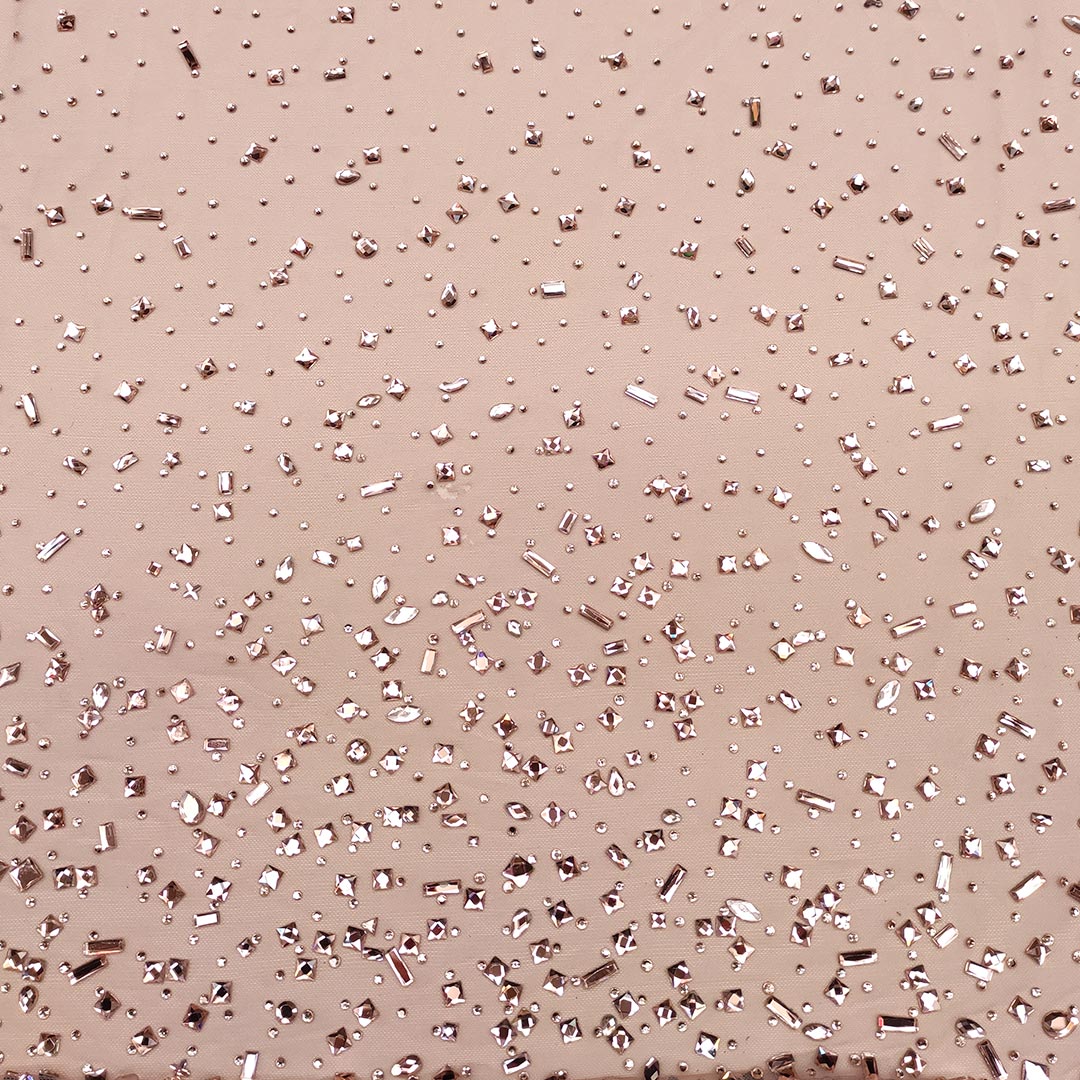 Tessuto Tulle mano seta ricamato con pietre motivo degradè rosa gold