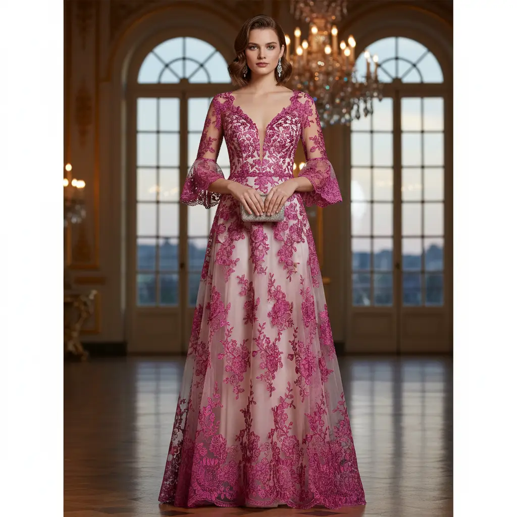 Tessuto Tulle mano seta ricamato motivo floreale fucsia