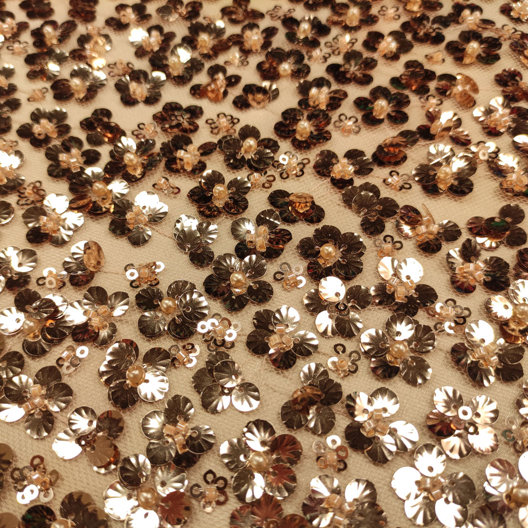 Tessuto Tulle mano seta ricamato paillettes motivo floreale bronzo