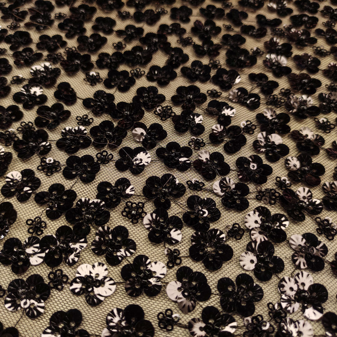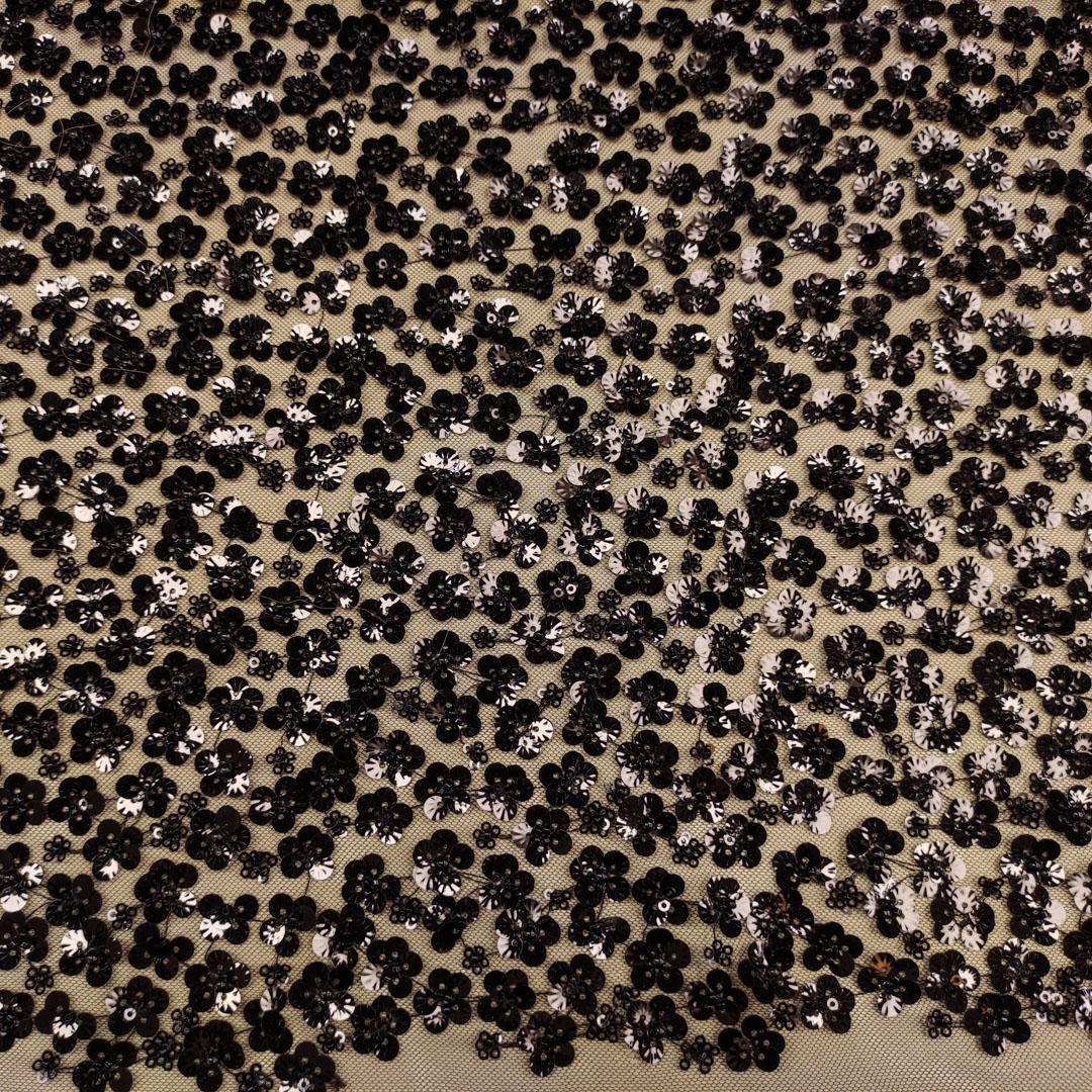 Tessuto Tulle mano seta ricamato paillettes motivo floreale nero