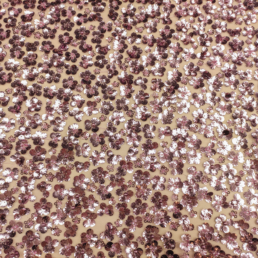 Tessuto Tulle mano seta ricamato paillettes motivo floreale rosa antico