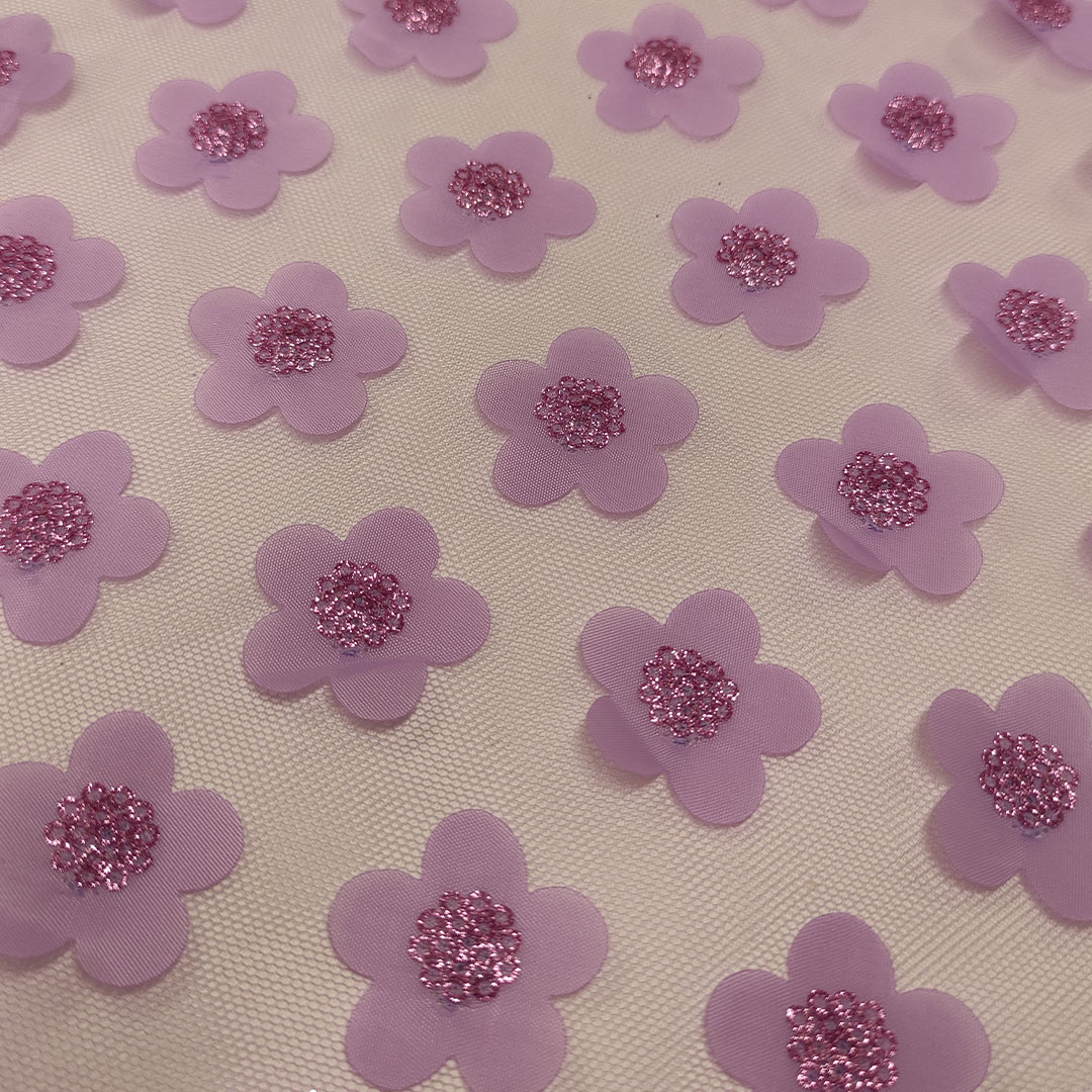 Tessuto Tulle – pizzo mano seta ricamato con fiori lilla