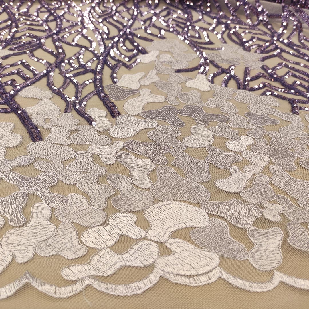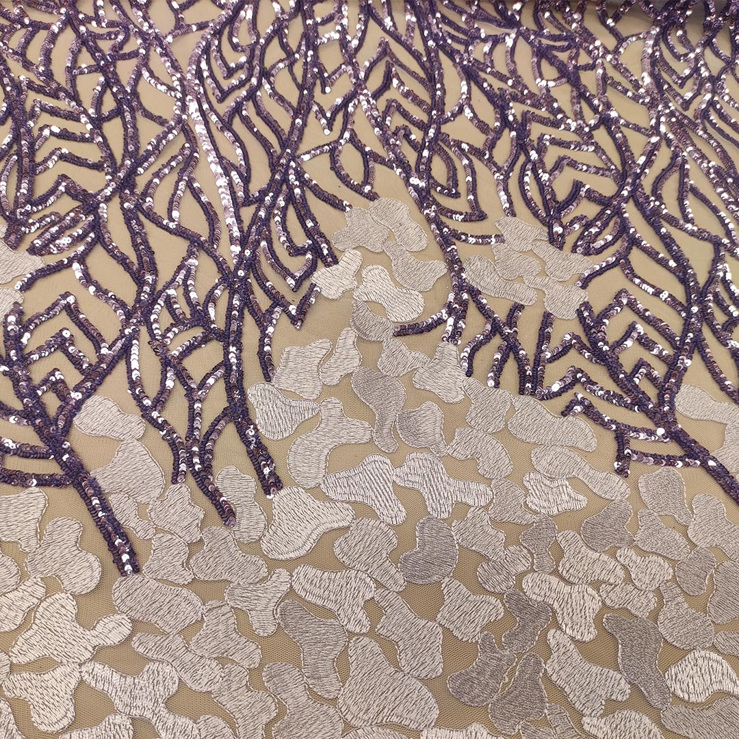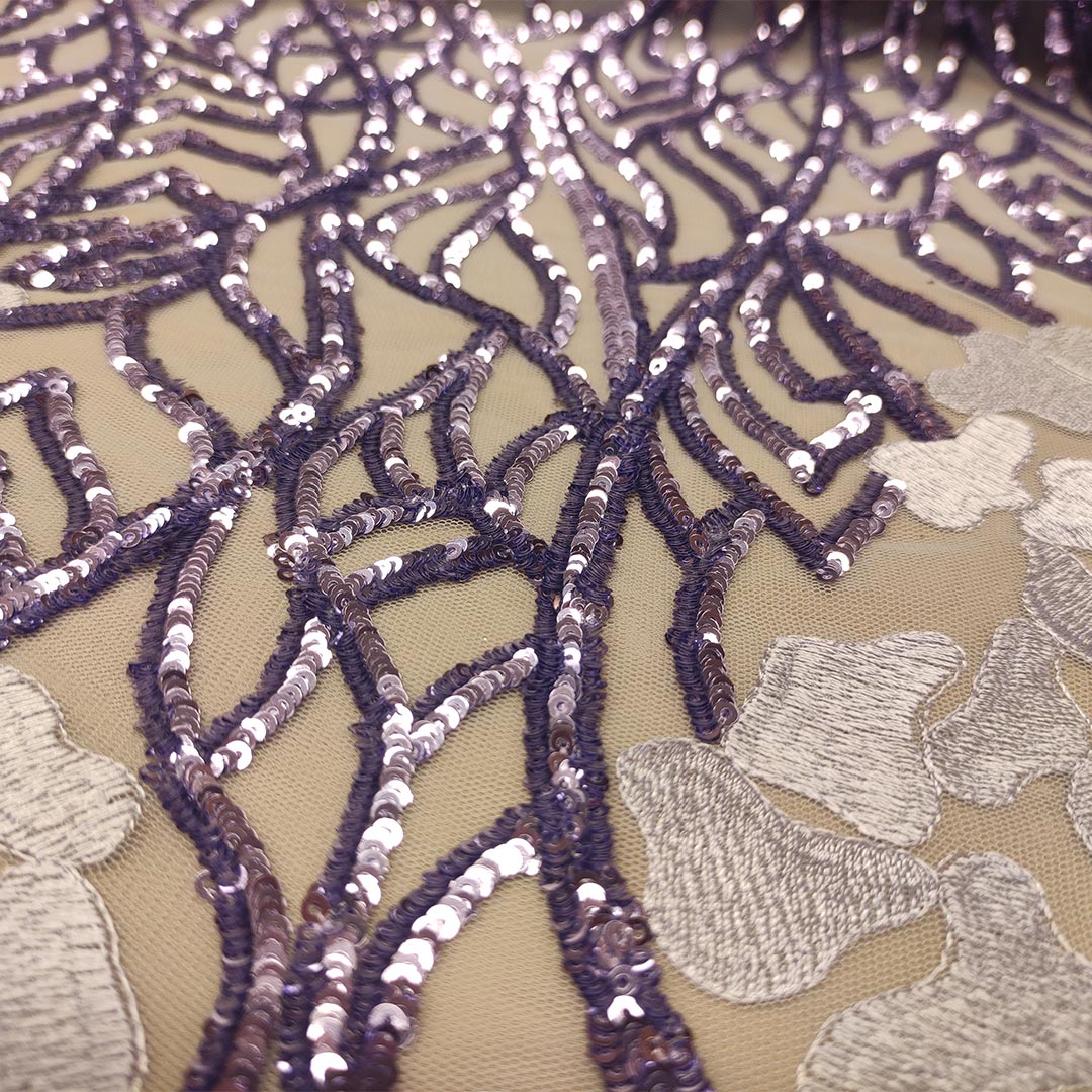 Tessuto Tulle – pizzo mano seta ricamato con paillettes motivo astratto lilla