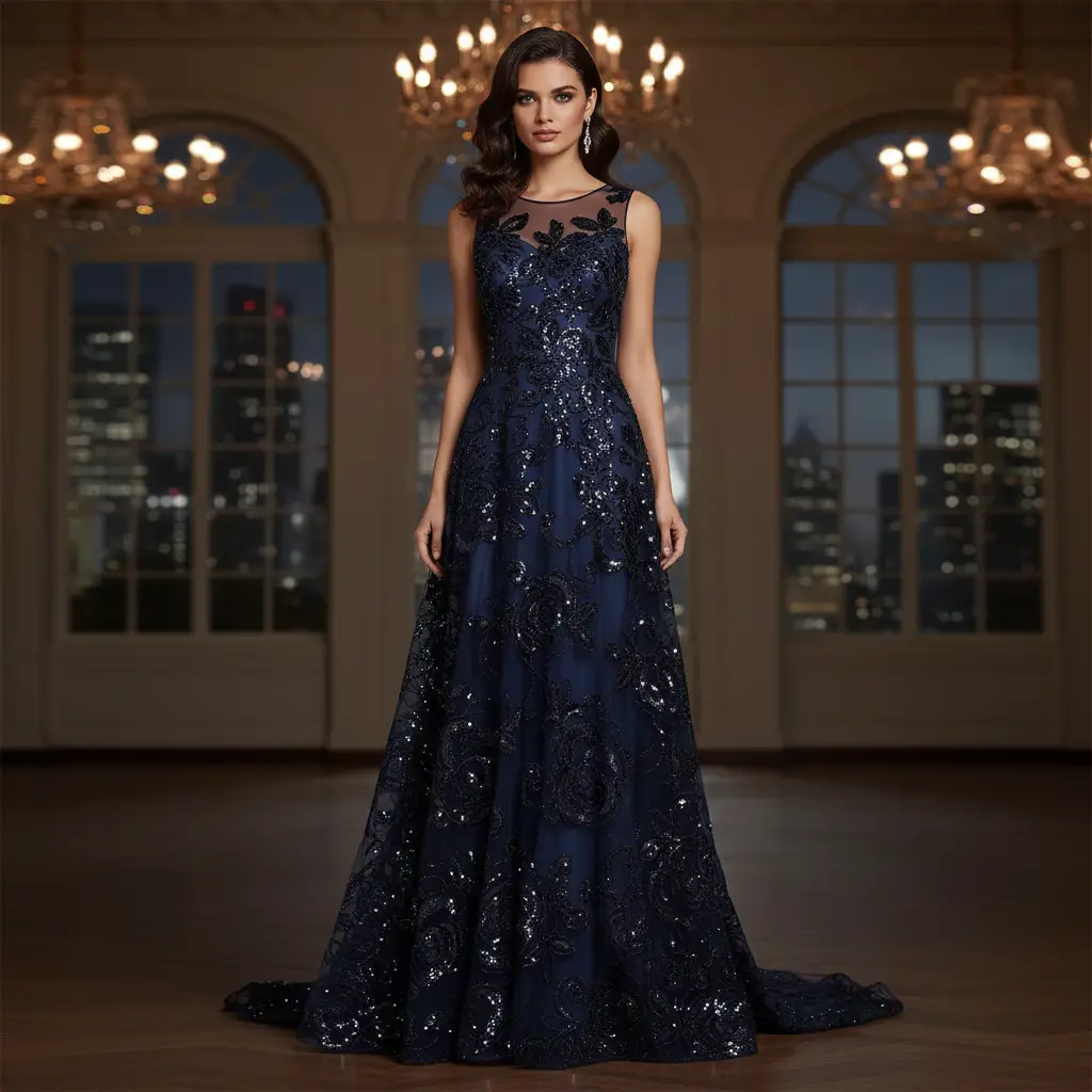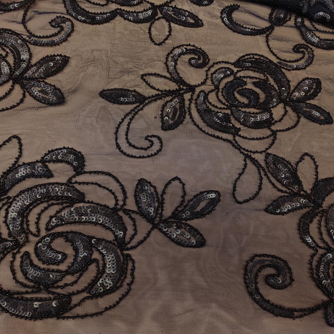 Tessuto Tulle – pizzo mano seta ricamato con paillettes motivo floreale blu notte