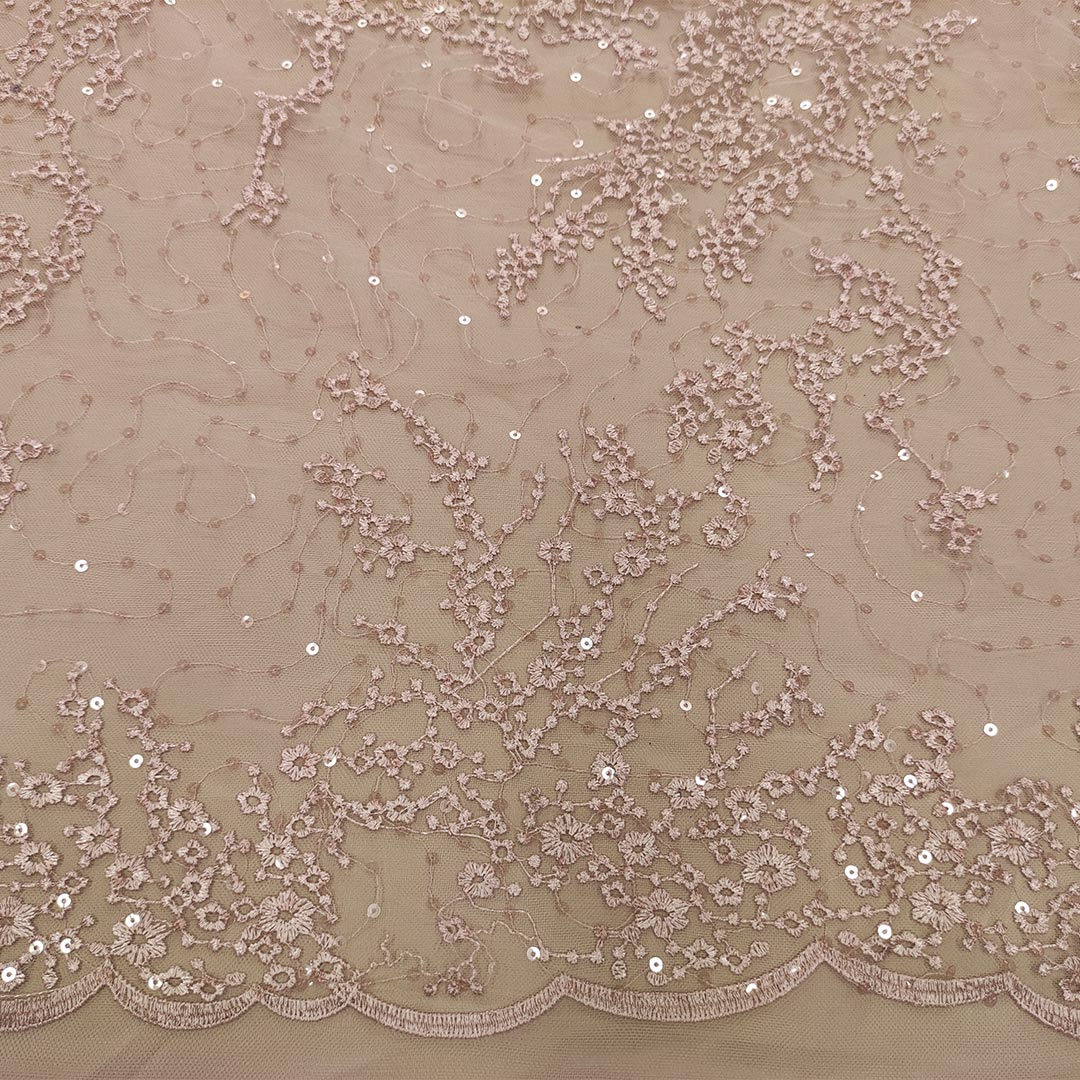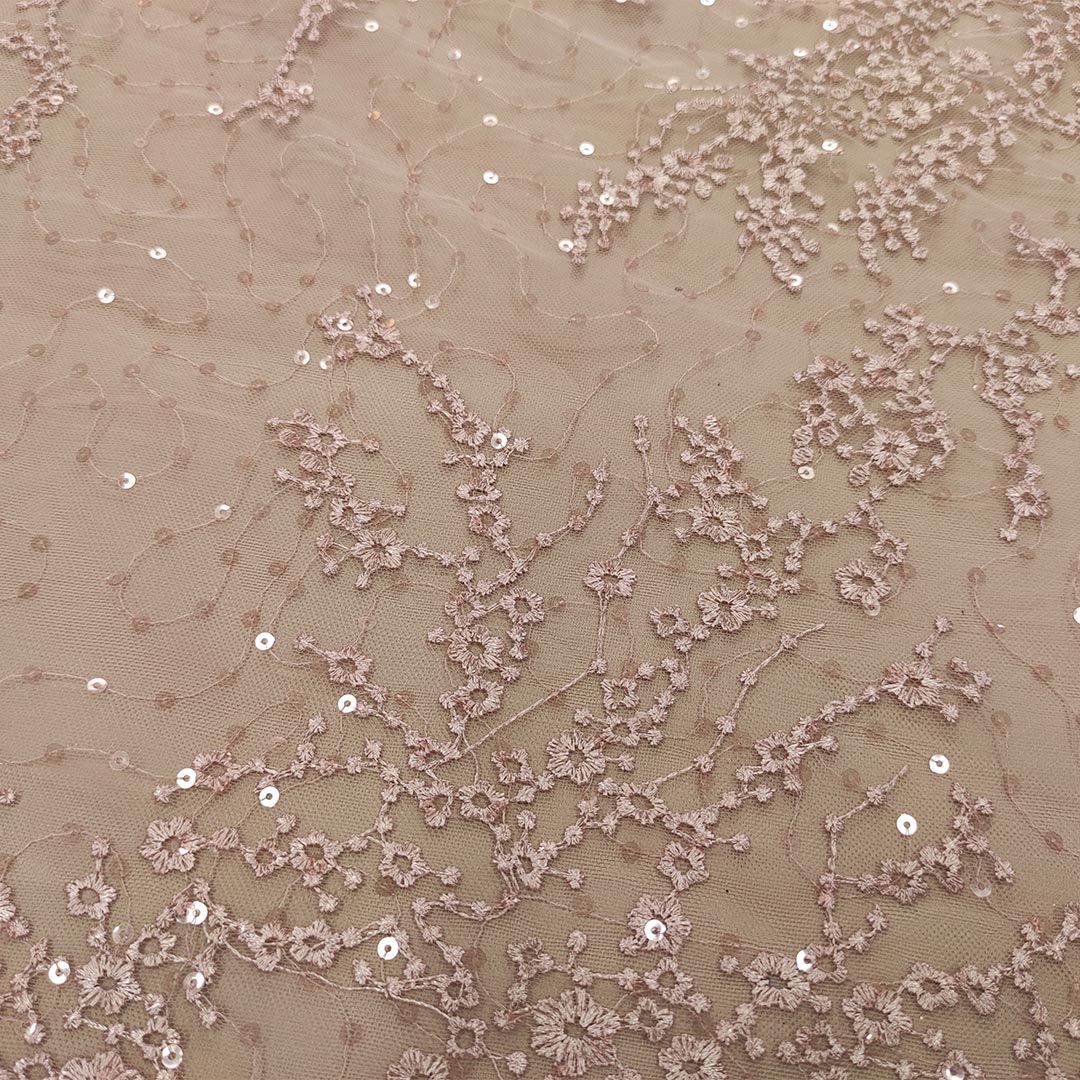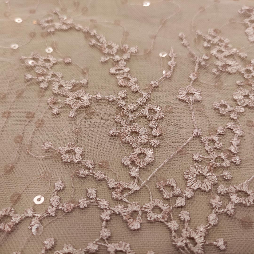 Tessuto Tulle – pizzo mano seta ricamato con paillettes motivo floreale rosa cipria