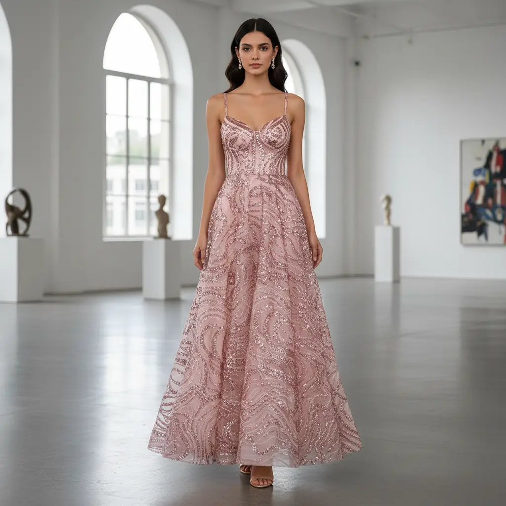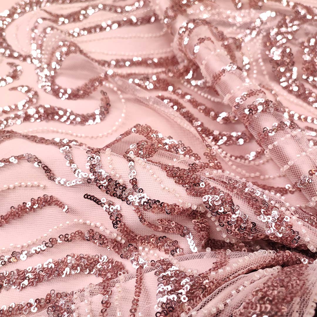 Tessuto Tulle mano seta ricamato con pietre e con paillettes ideale per realizzare capi da cerimonia esclusivi ed eleganti.