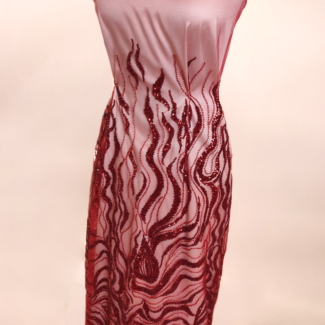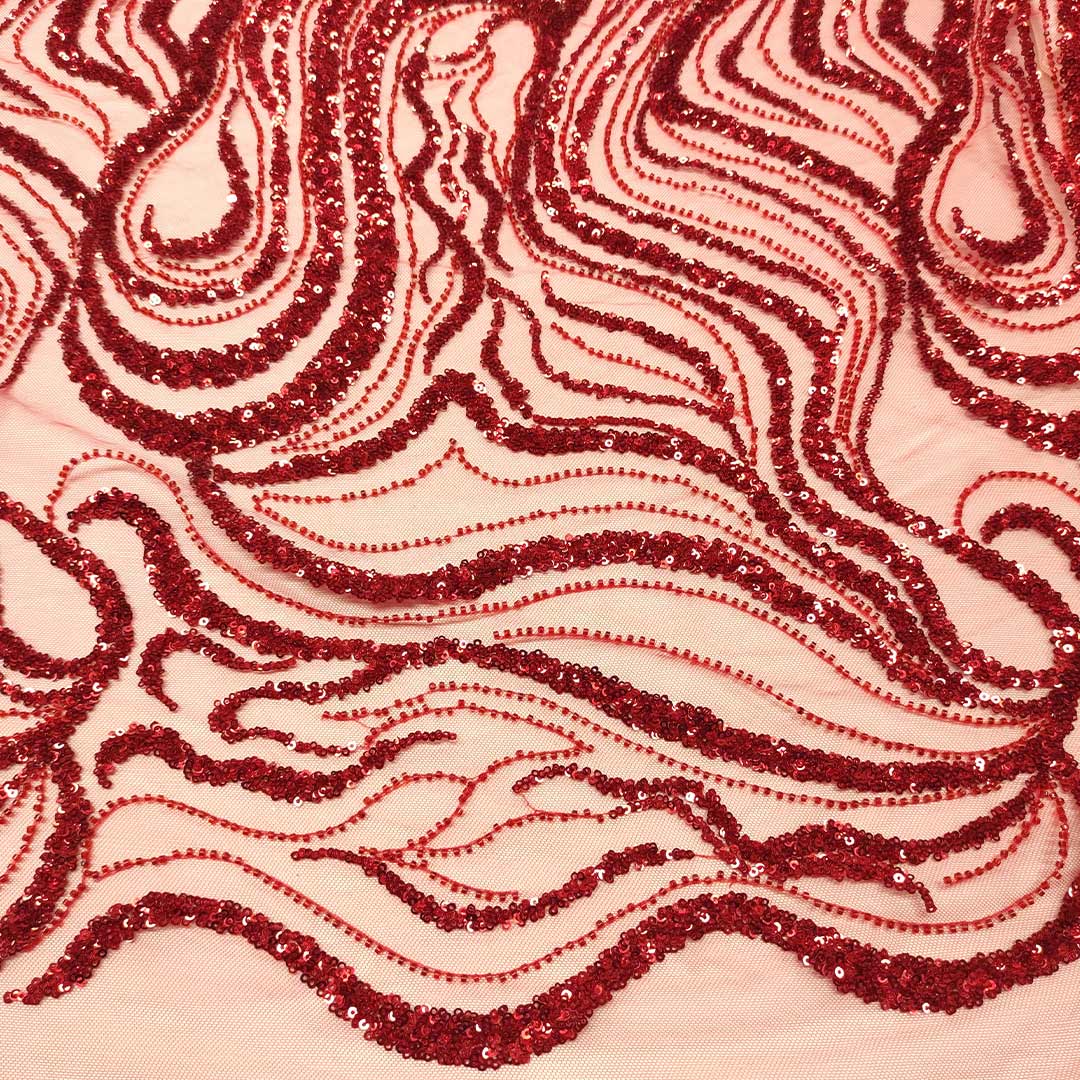 Tessuto Tulle – pizzo mano seta ricamato con pietre e con paillettes motivo astratto rosso