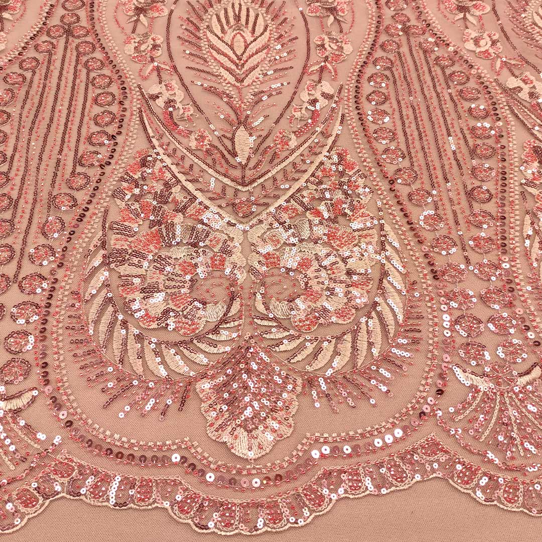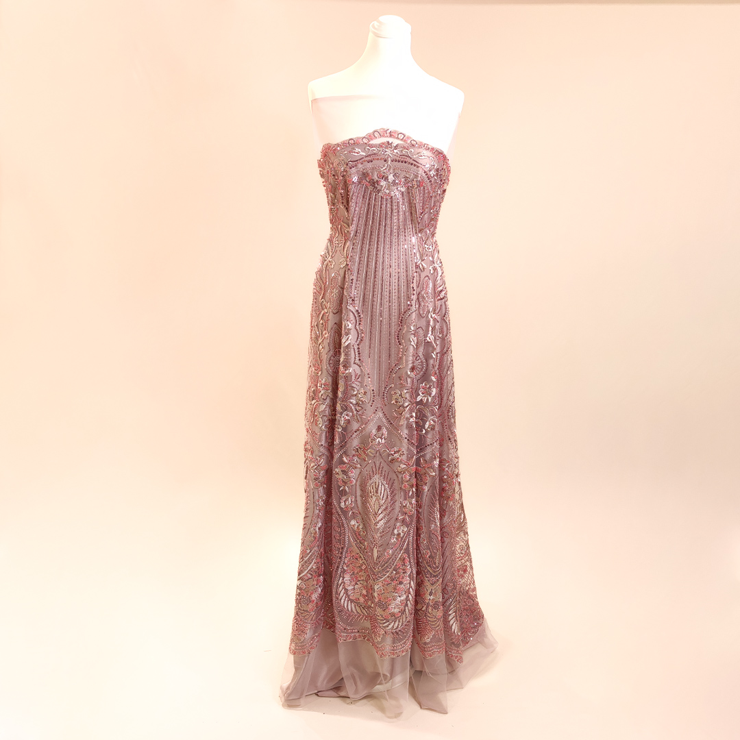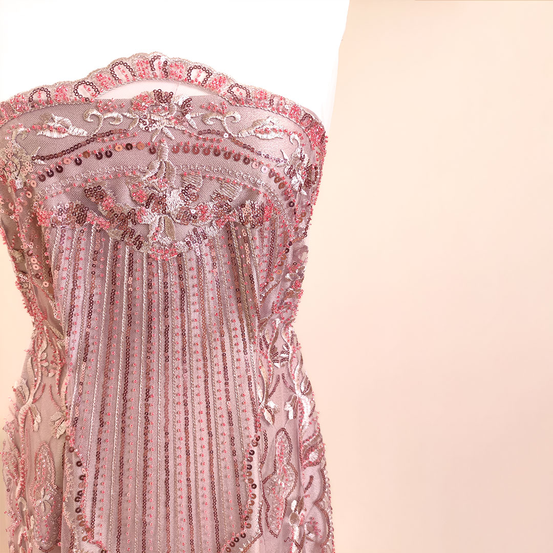 Tessuto tulle – pizzo mano seta ricamato con pietre e con paillettes motivo floreale barocco rosa