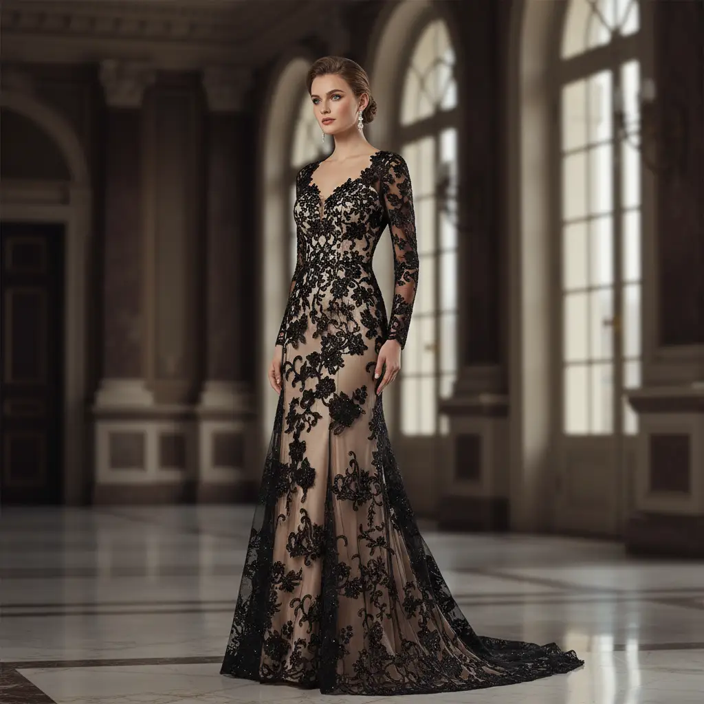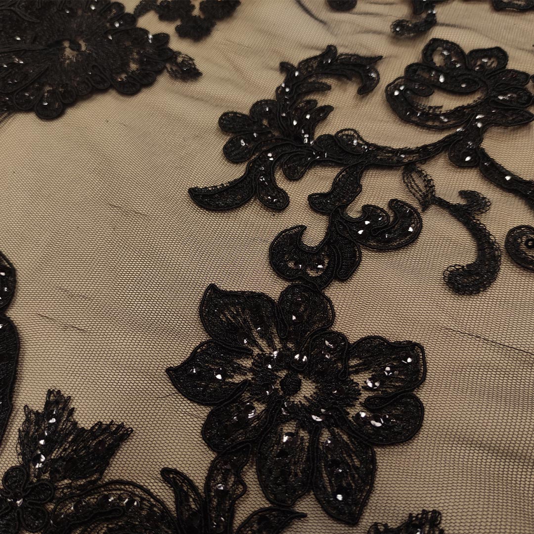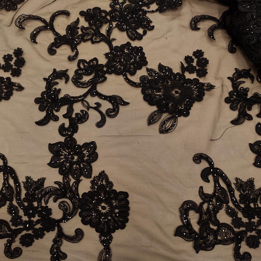 Tessuto Tulle – pizzo mano seta ricamato con pietre motivo floreale nero