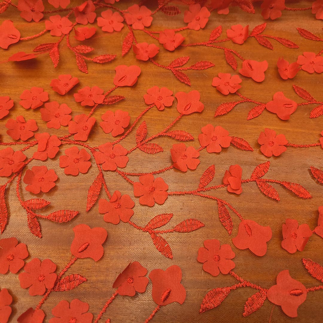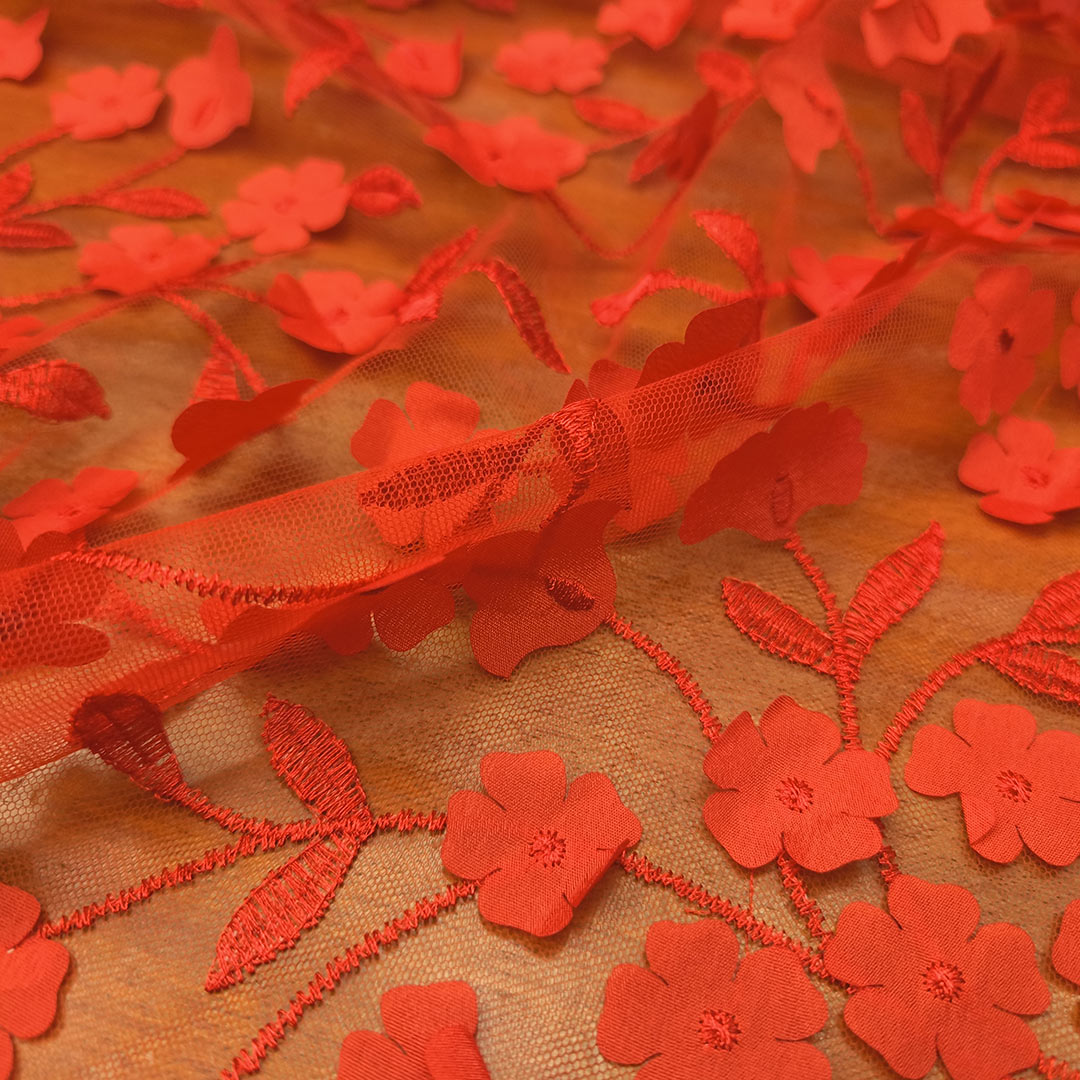 Tessuto Tulle ricamato con fiori 3d tinta unita rosso