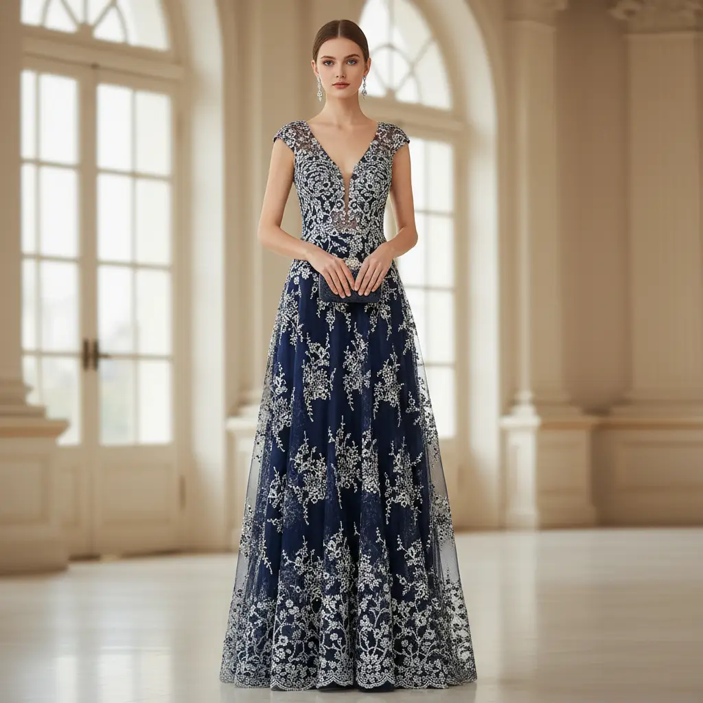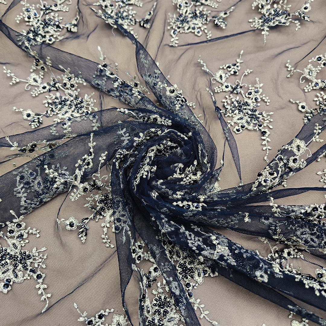 Tessuto Tulle ricamato con perle e con pietre motivo floreale blu – oro