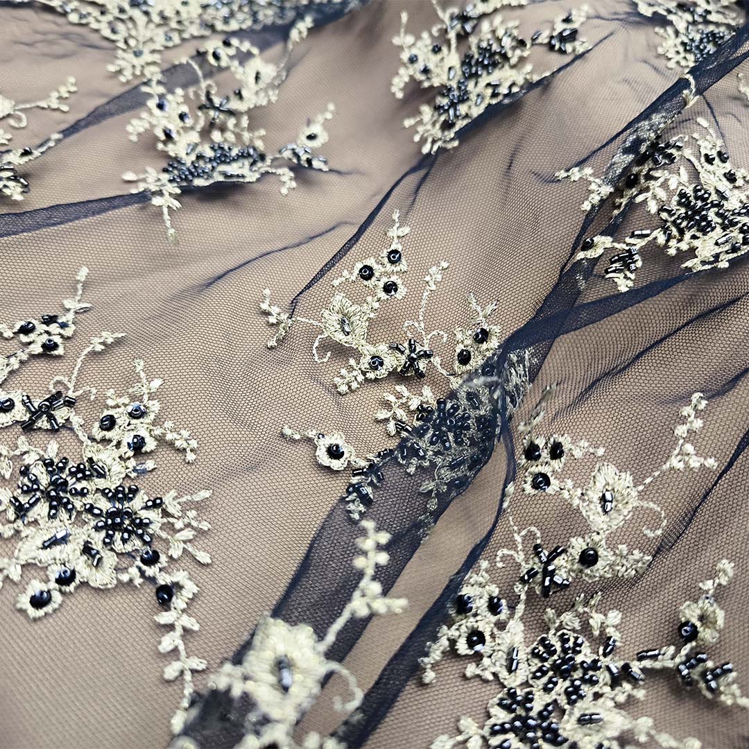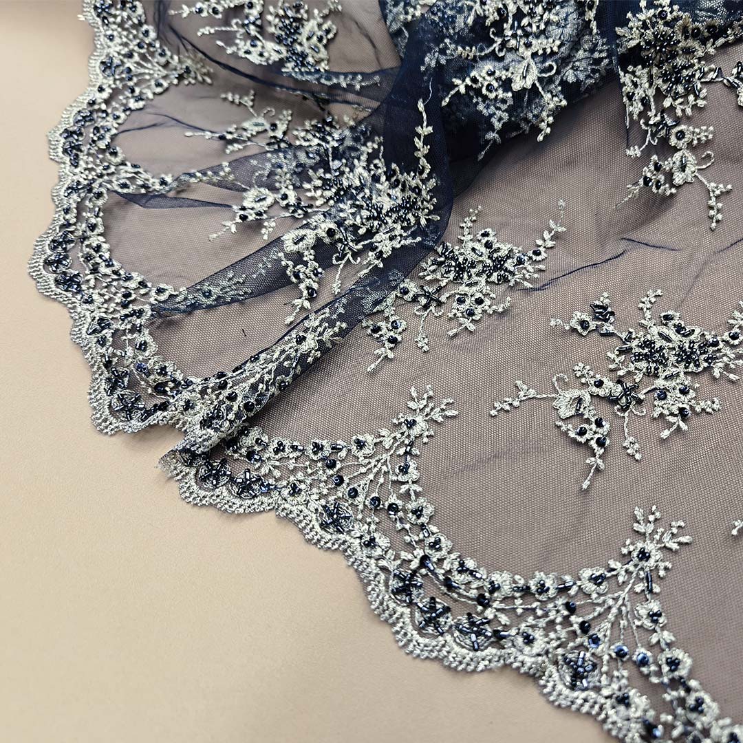 Tessuto Tulle doppio smerlo Ricamato con pietre e con perle ideale per realizzare capi da cerimonia esclusivi ed eleganti.