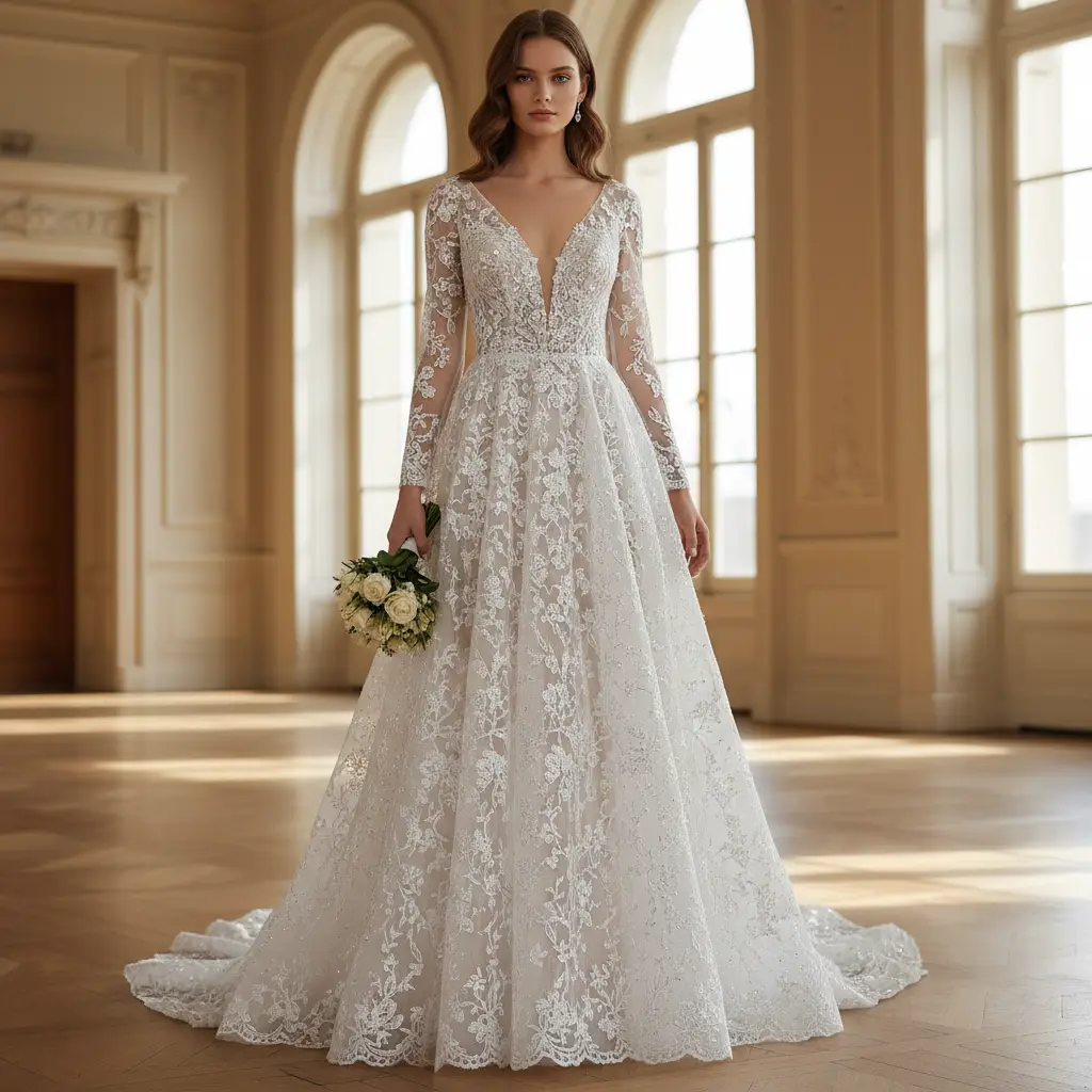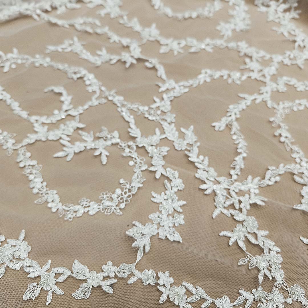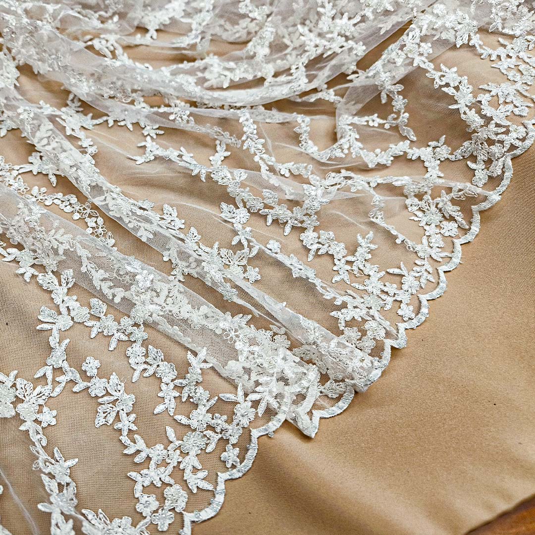 Tessuto Tulle Ricamato doppio smerlo con perle ideale per realizzare capi da cerimonia esclusivi ed eleganti.