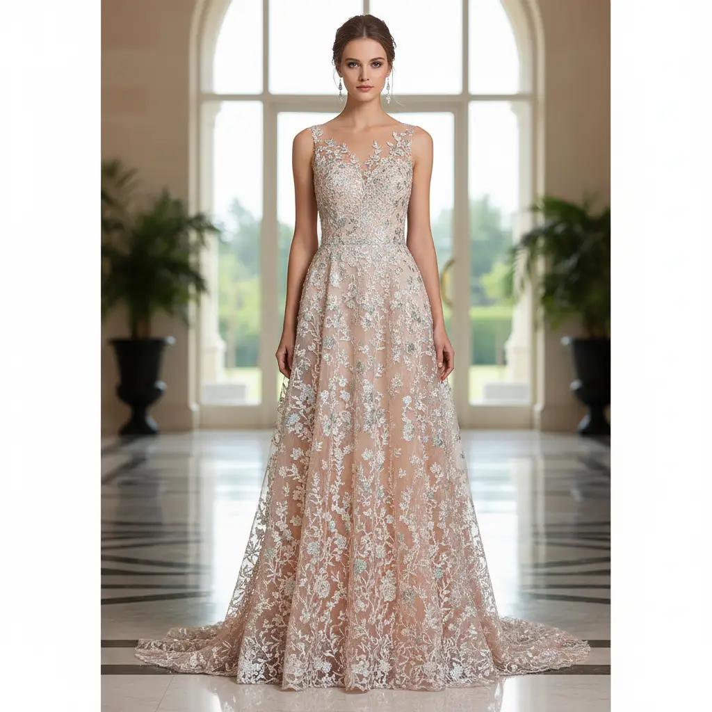 Tessuto Tulle Ricamato con perle motivo sfumato ideale per realizzare capi da cerimonia esclusivi ed eleganti.