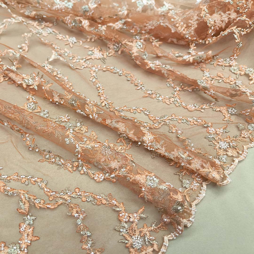 Tessuto Tulle ricamato con perle motivo sfumato corallo