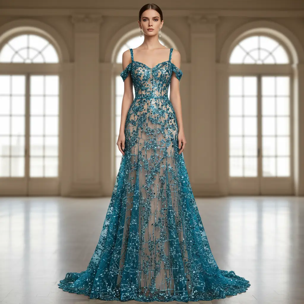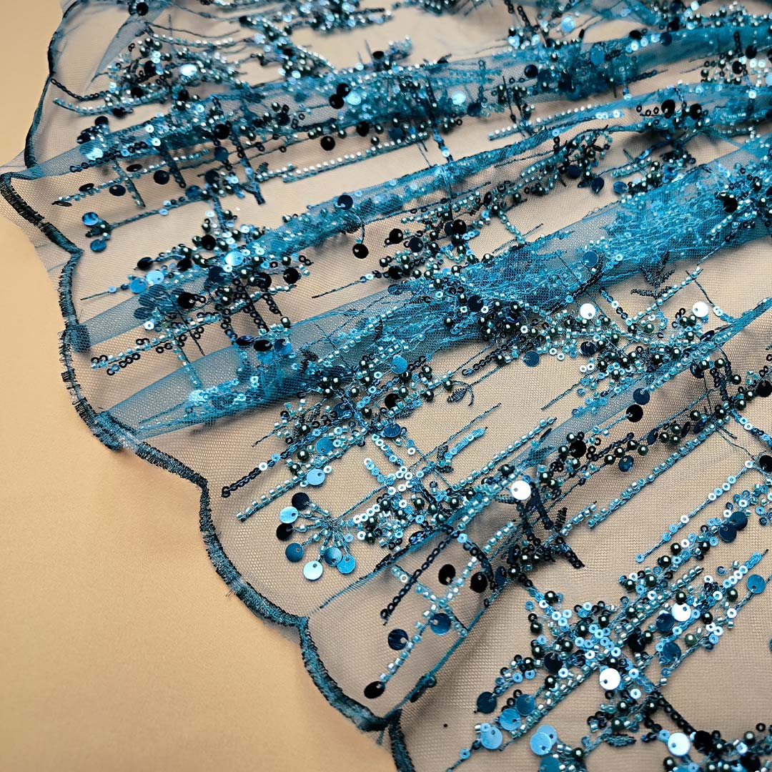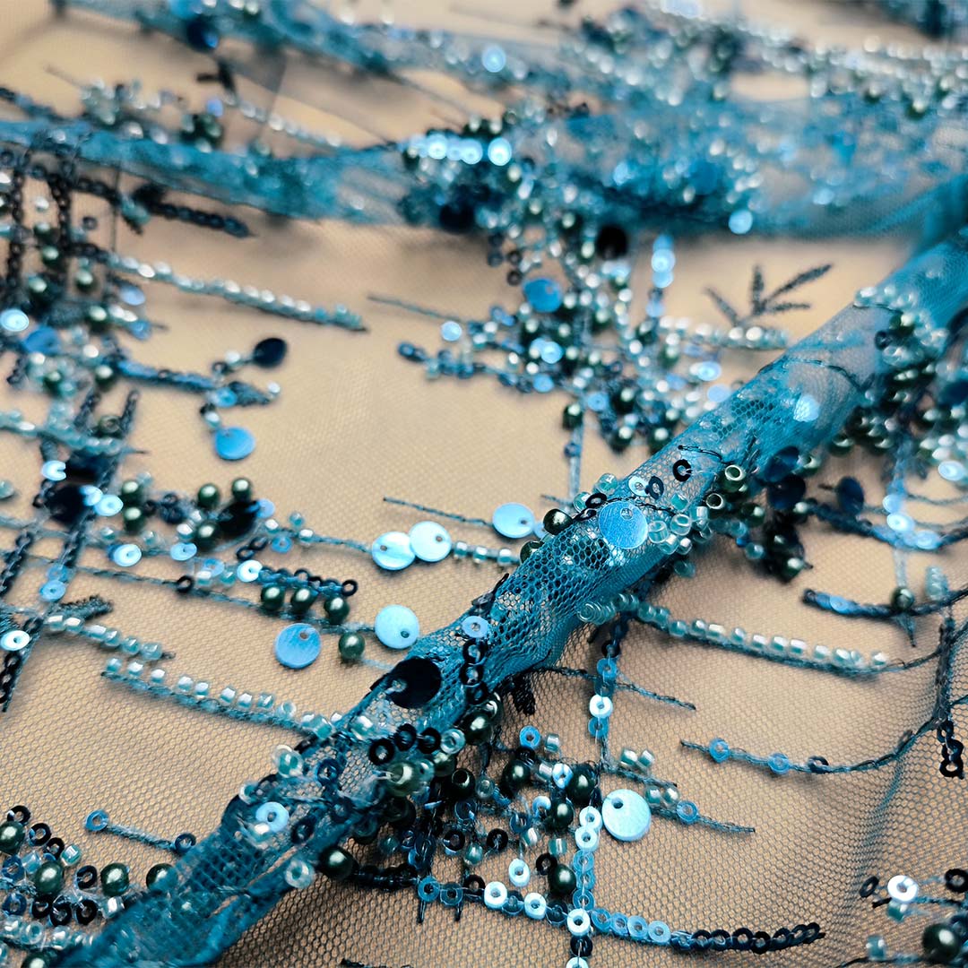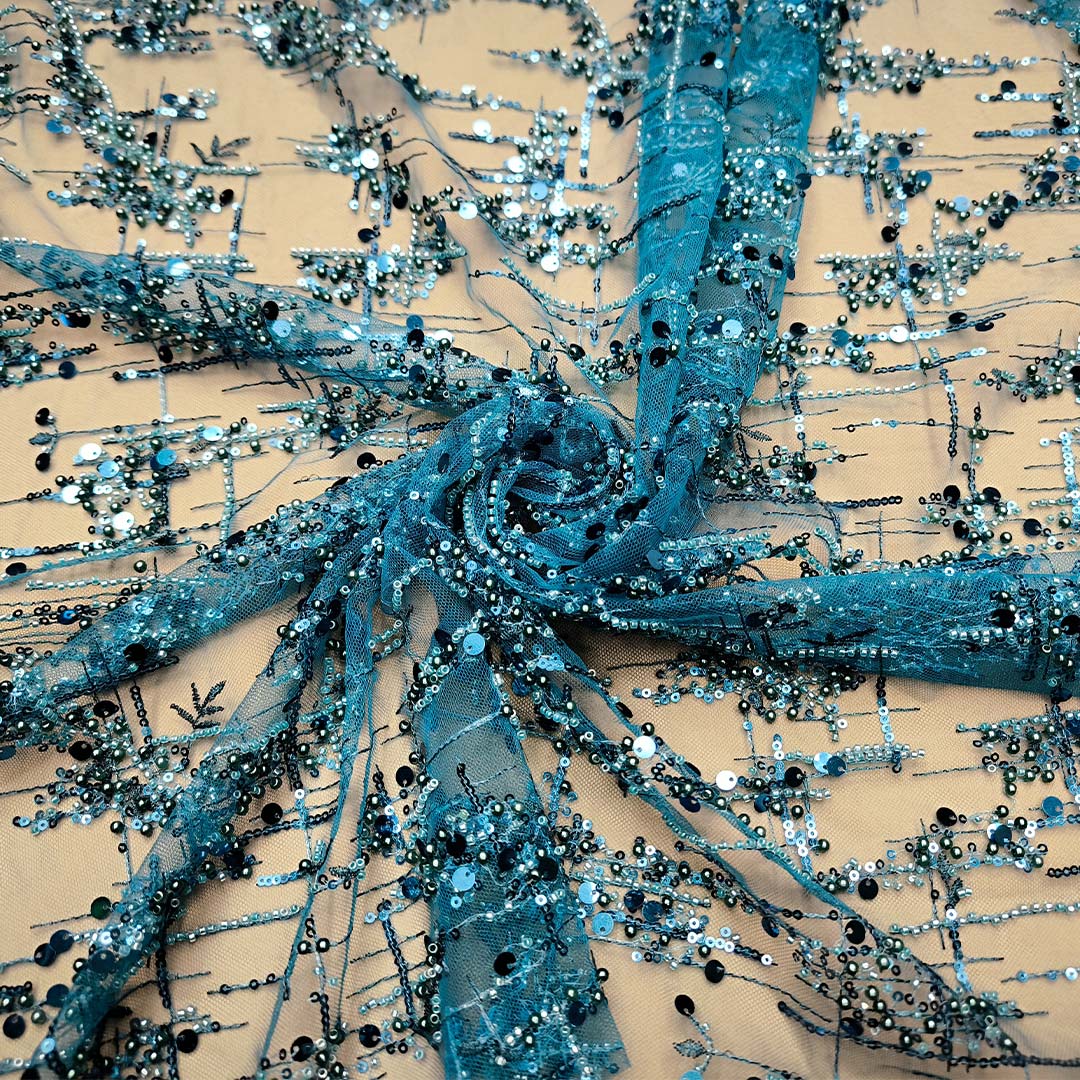 Tessuto Tulle ricamato con pietre e con paillettes motivo astratto ottanio
