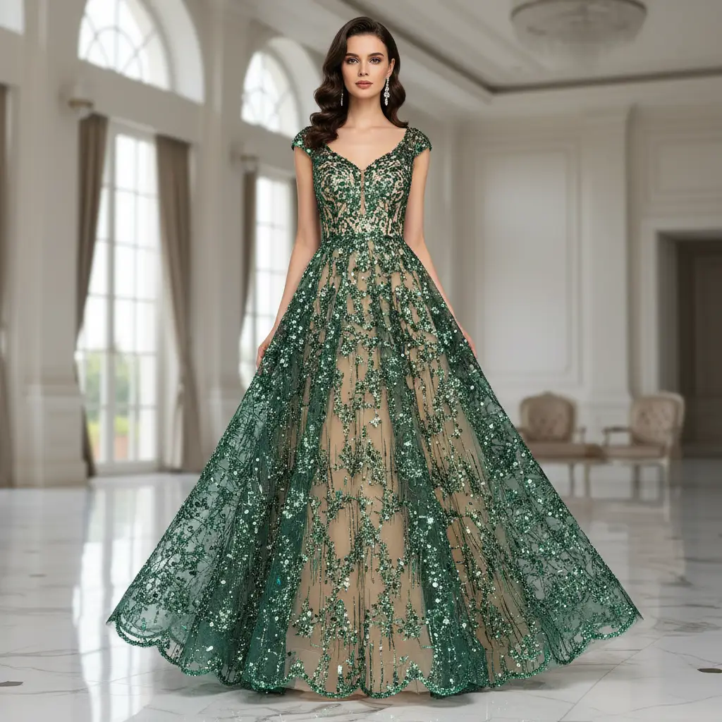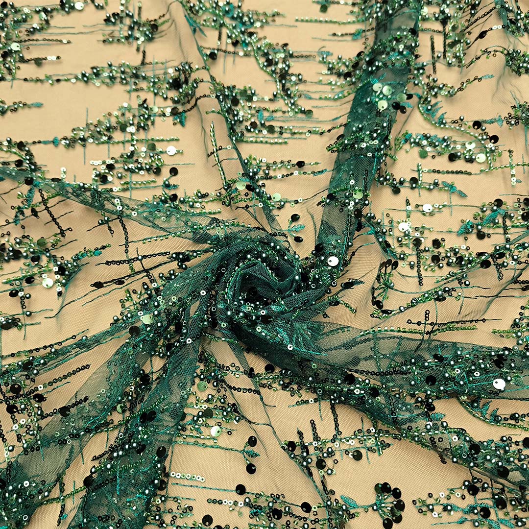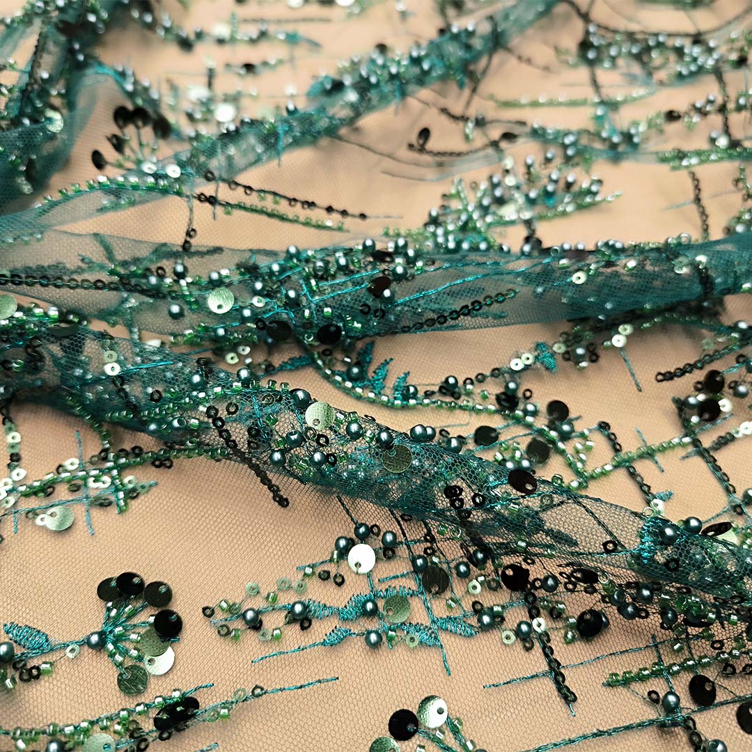 Tessuto Tulle ricamato con pietre e con paillettes motivo astratto verde bottiglia