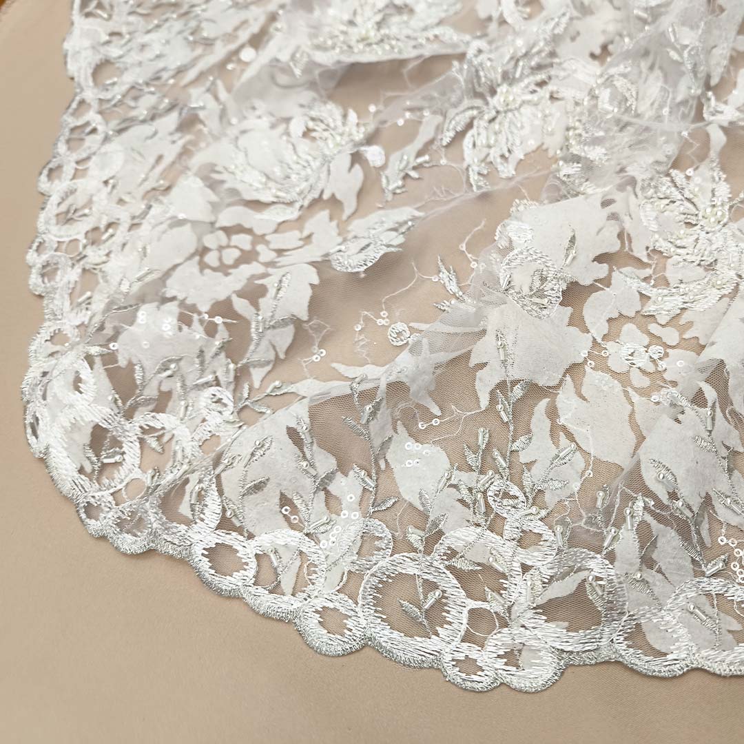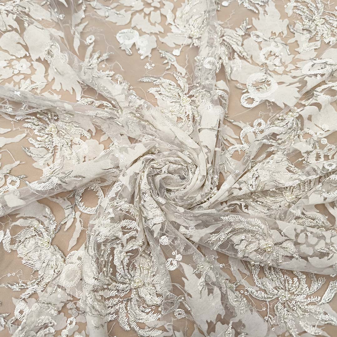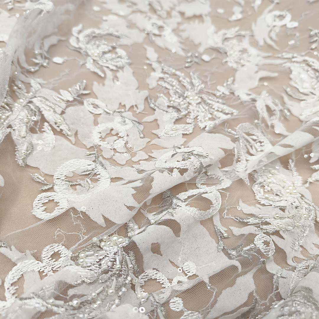 Tessuto Tulle ricamato devorè con pietre e con perle motivo floreale bianco seta