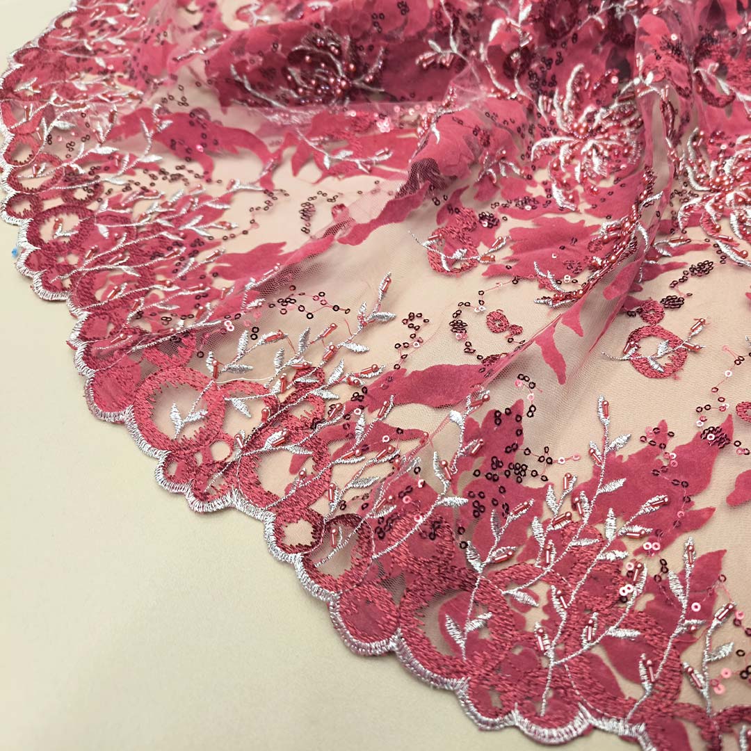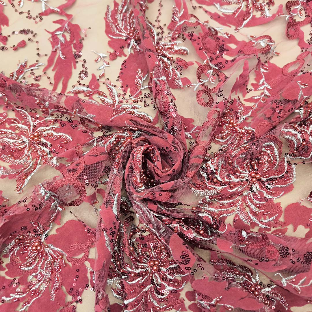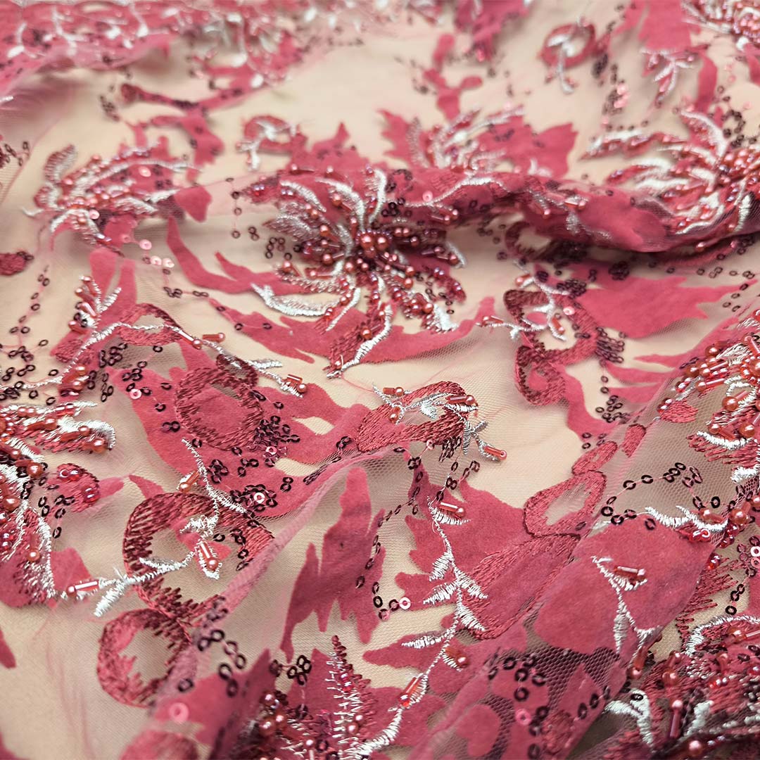 Tessuto Tulle devorè doppio smerlo Ricamato con pietre e con perle ideale per realizzare capi da cerimonia esclusivi ed eleganti.