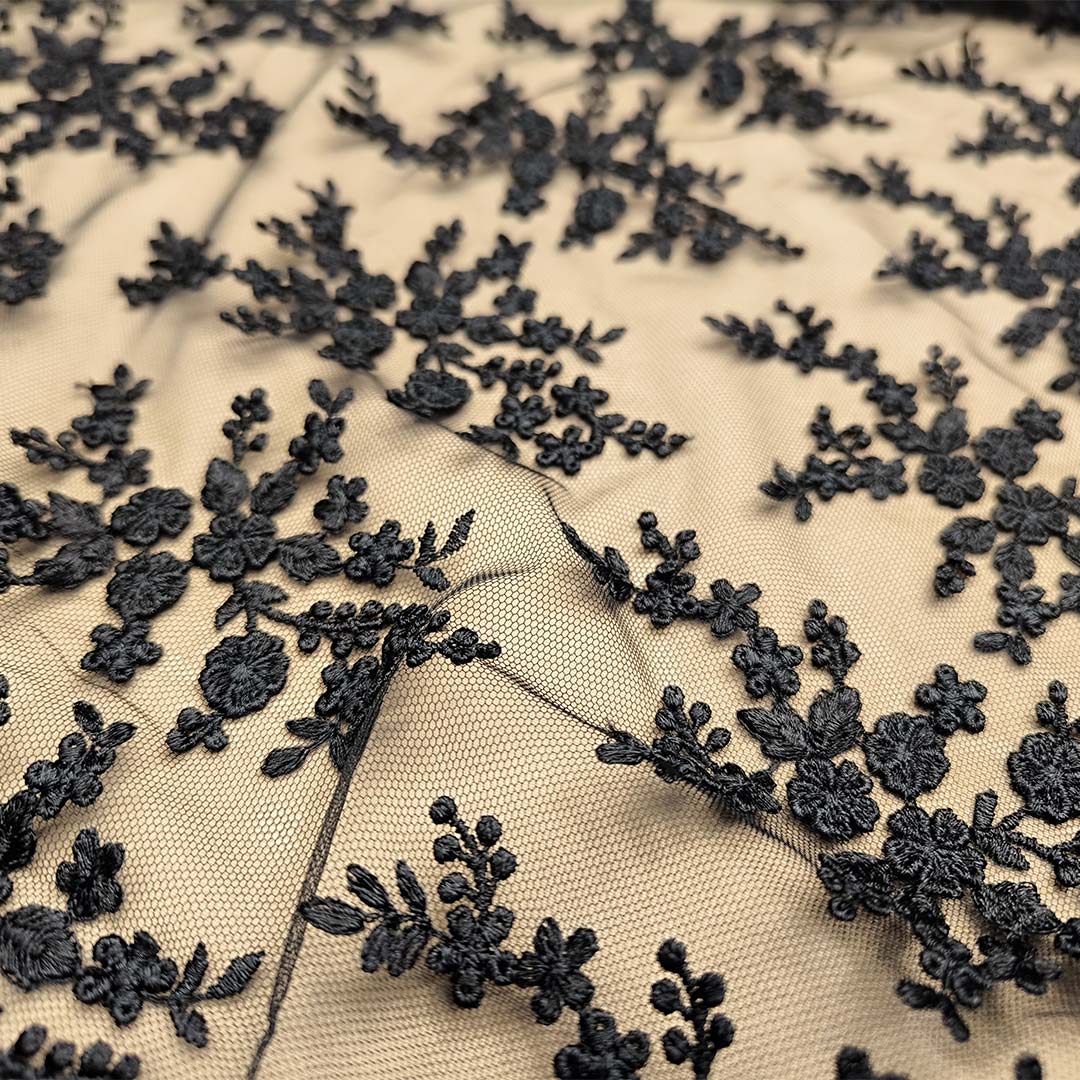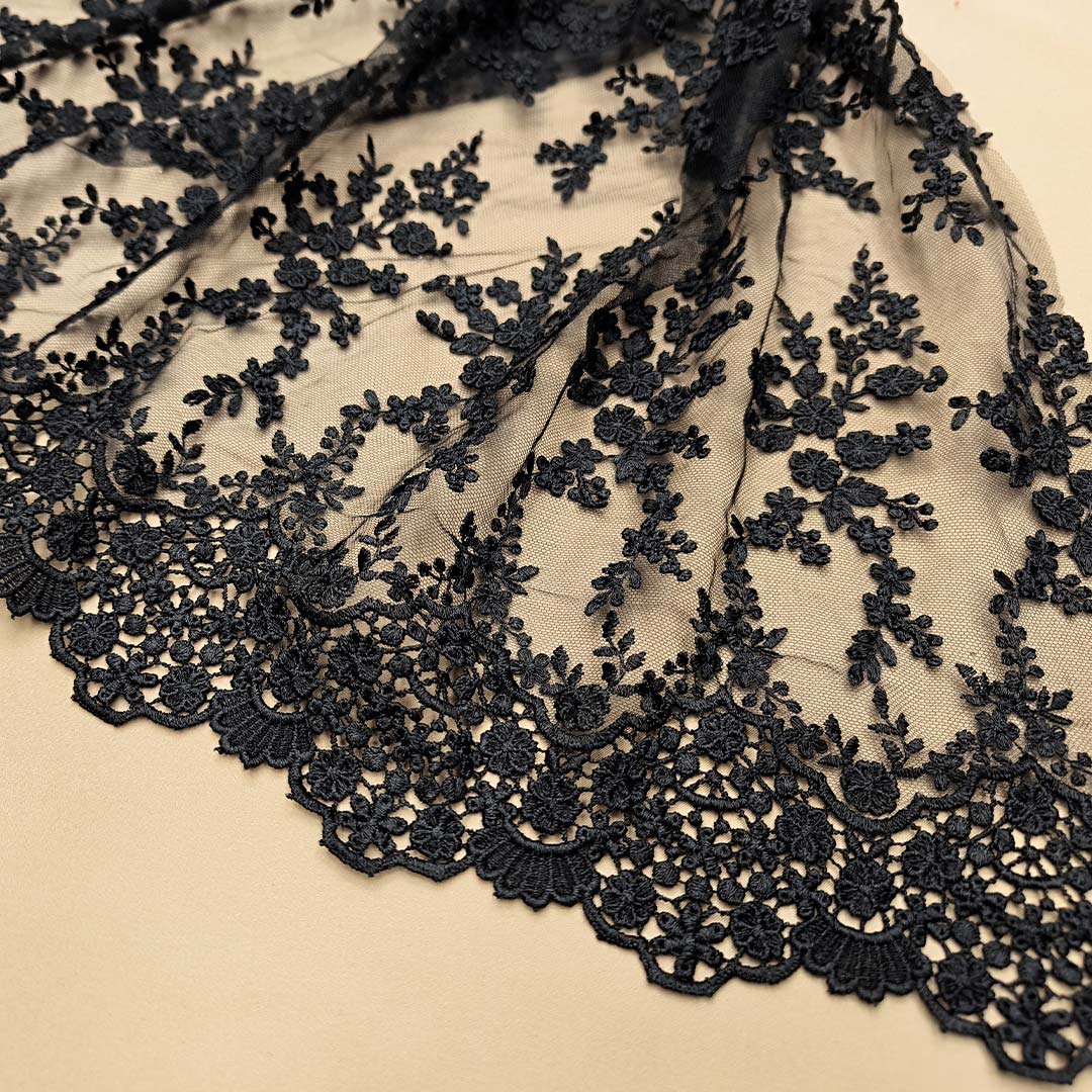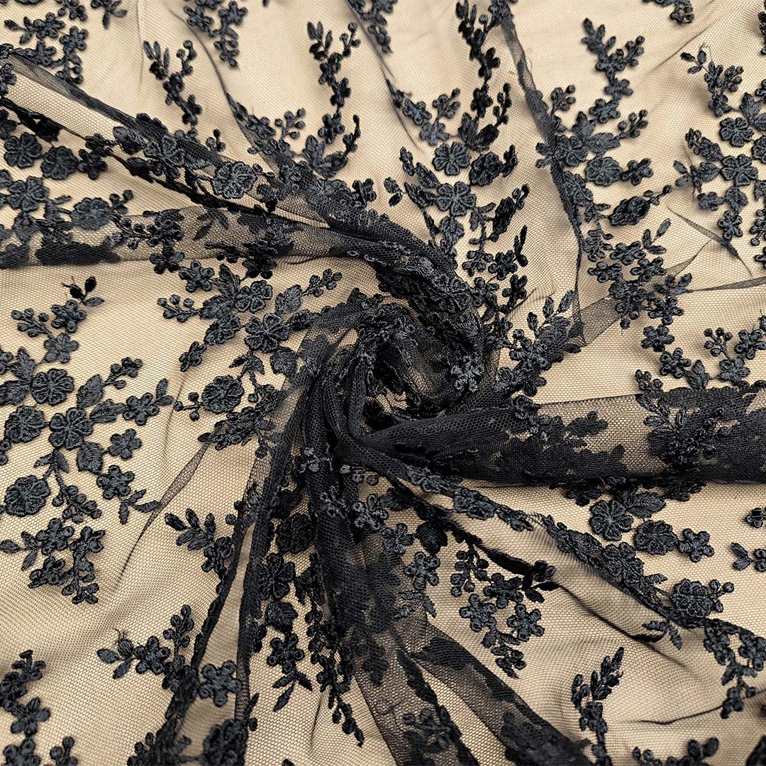 Tessuto Tulle ricamato doppio smerlo motivo floreale nero