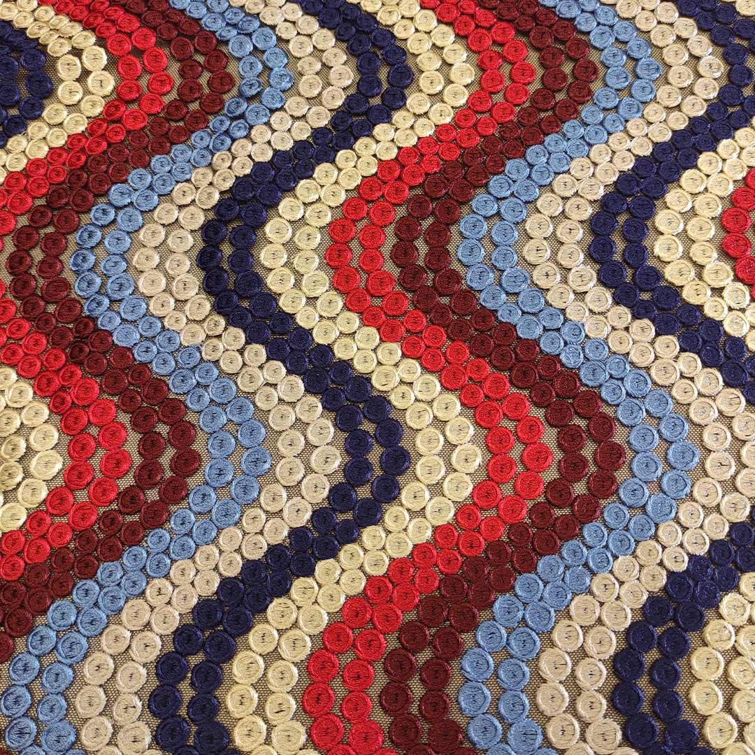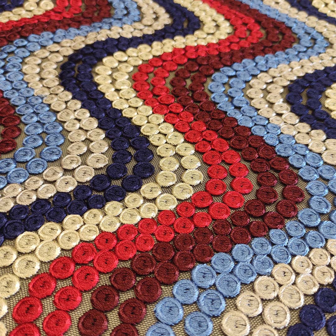 Tessuto Tulle ricamato motivo astratto blu – rosso – beige