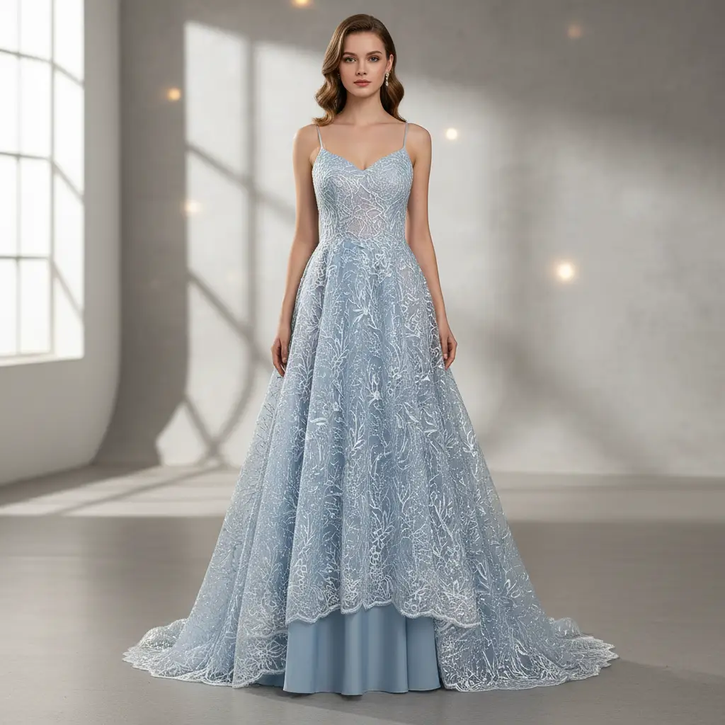 Tessuto Tulle ricamato motivo floreale celeste
