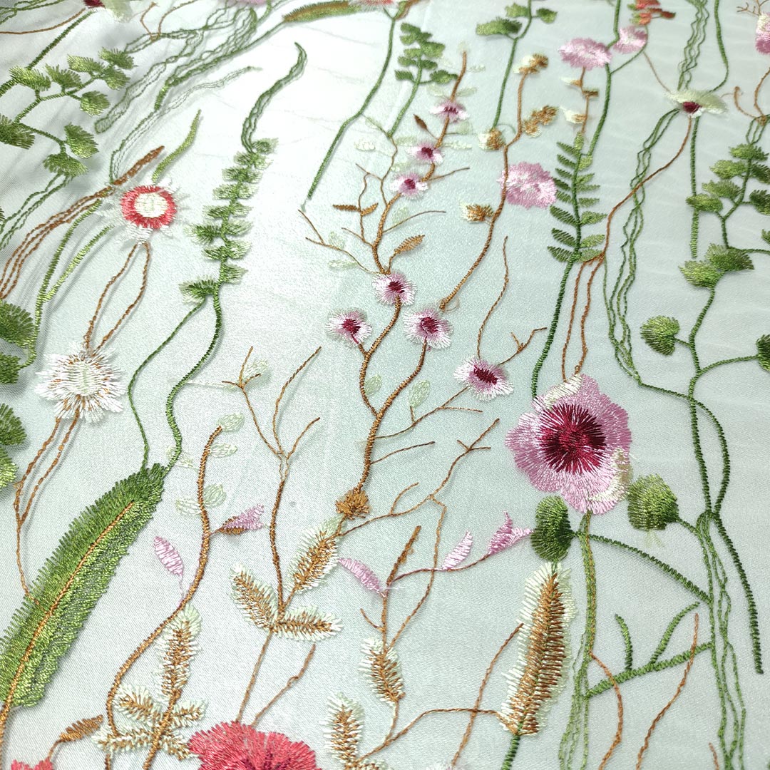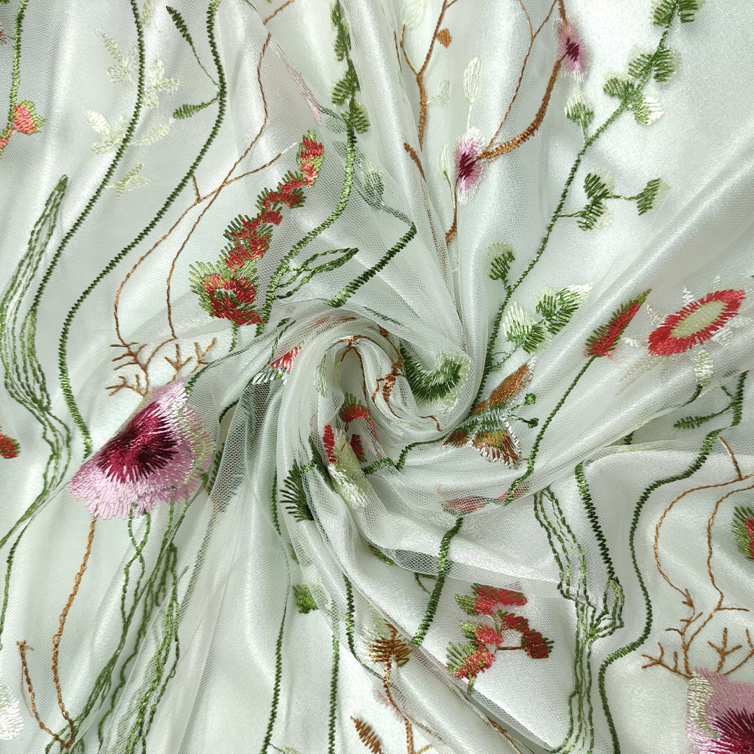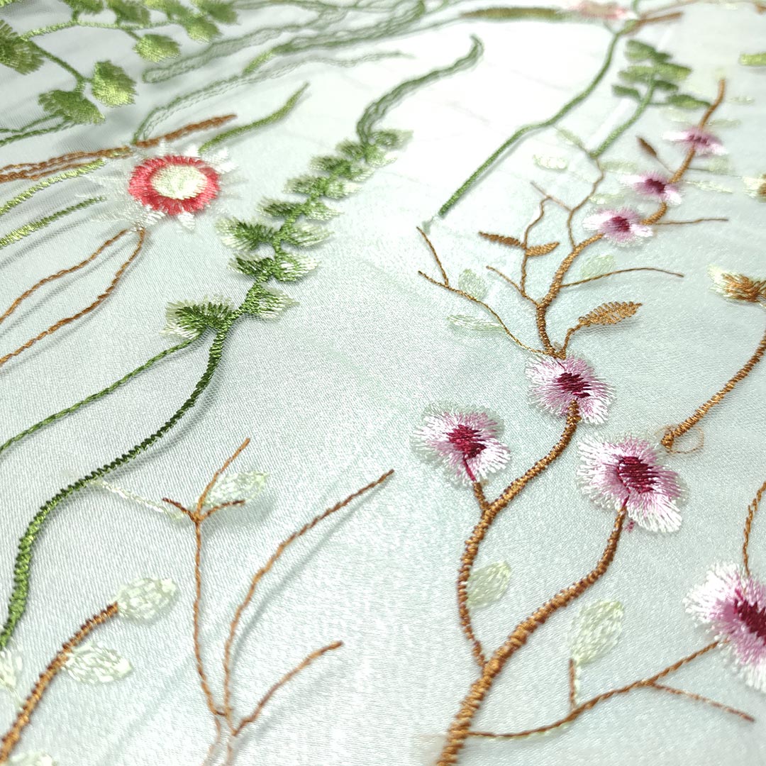 Tessuto Tulle ricamato motivo floreale rosa – verde – bianco