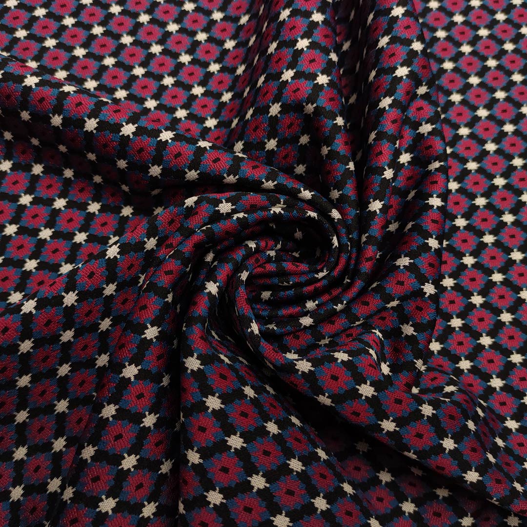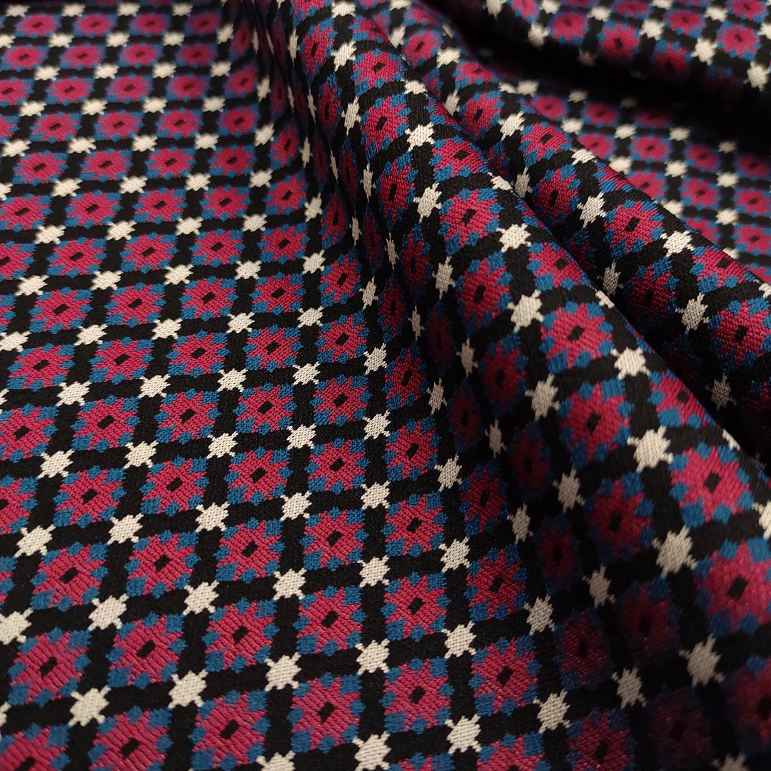 Tessuto Punto Milano a fantasia motivo geometrico nero – borgogna – ottanio – panna