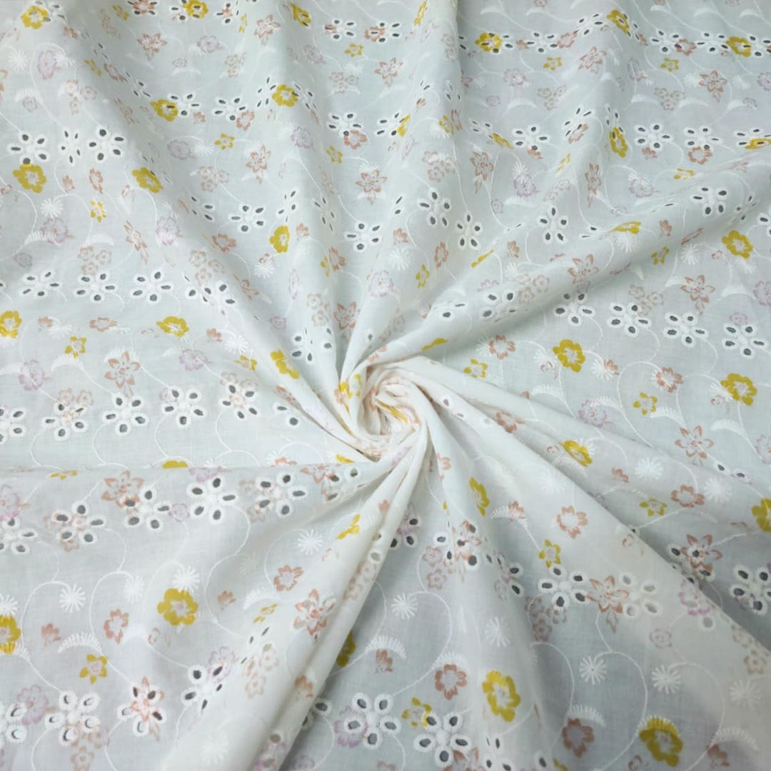 Tessuto Sangallo a fantasia motivo floreale bianco – rosa – giallo