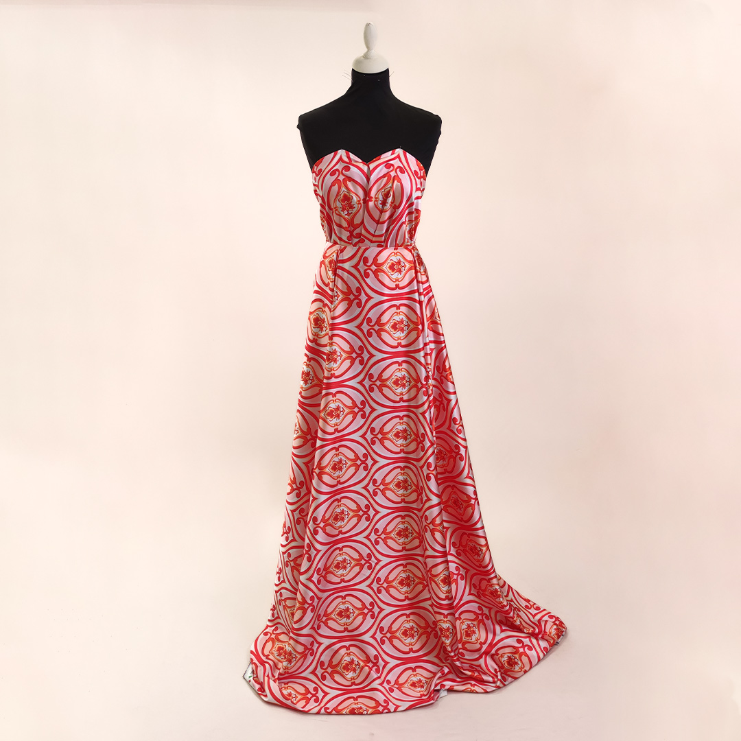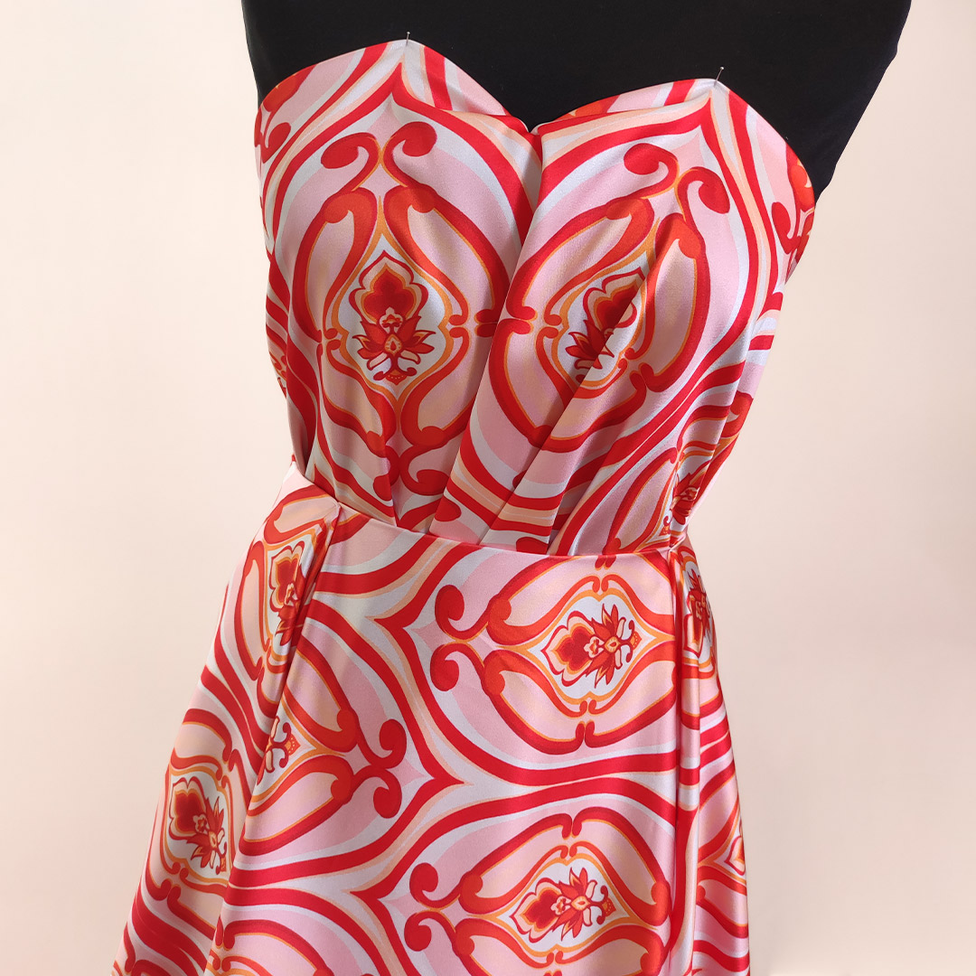 Tessuto Doppio raso a fantasia motivo astratto arancione – rosso – rosa
