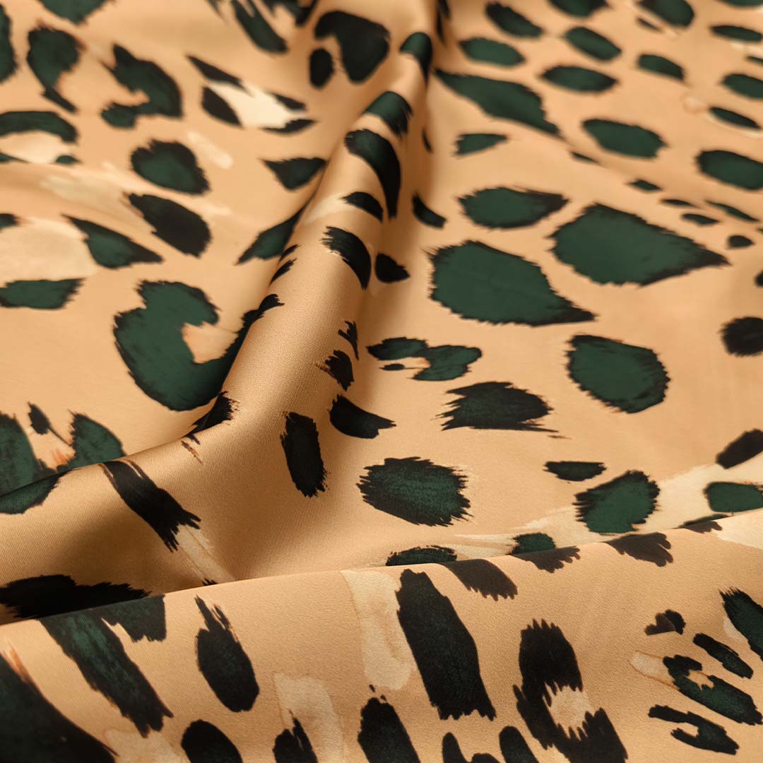 Tessuto Satin a fantasia motivo animalier beige – verde bottiglia