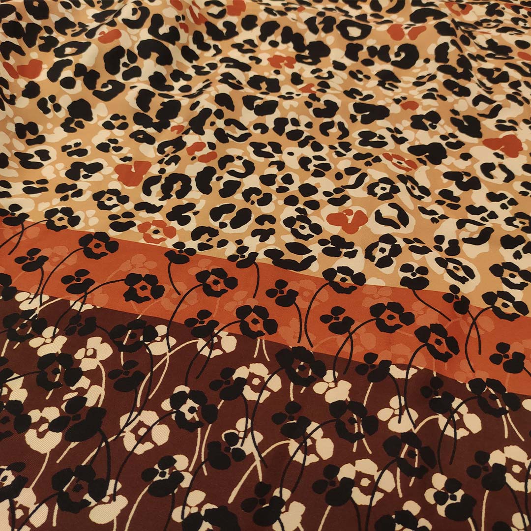 Tessuto Satin a fantasia motivo animalier nero – beige – arancione