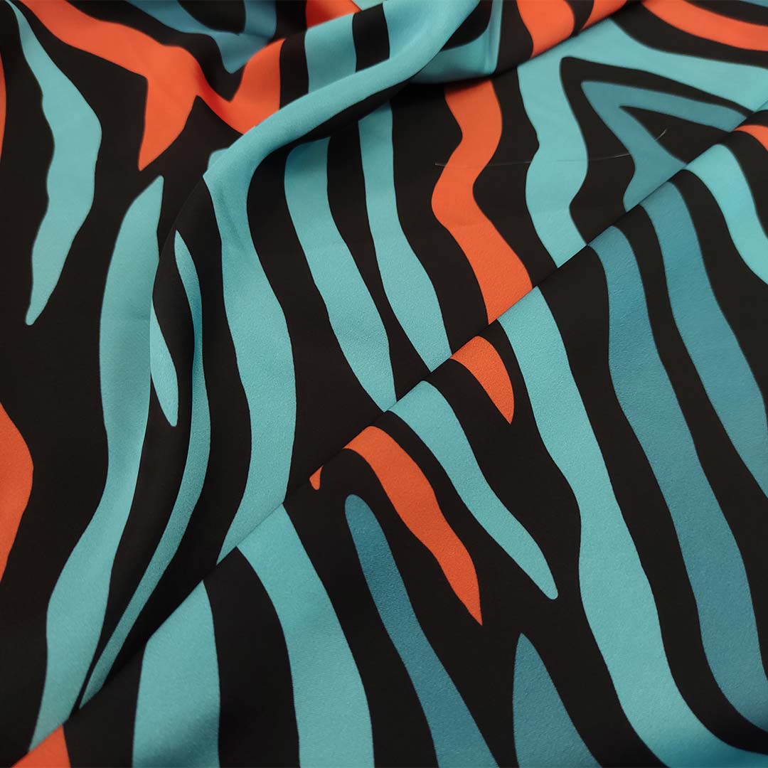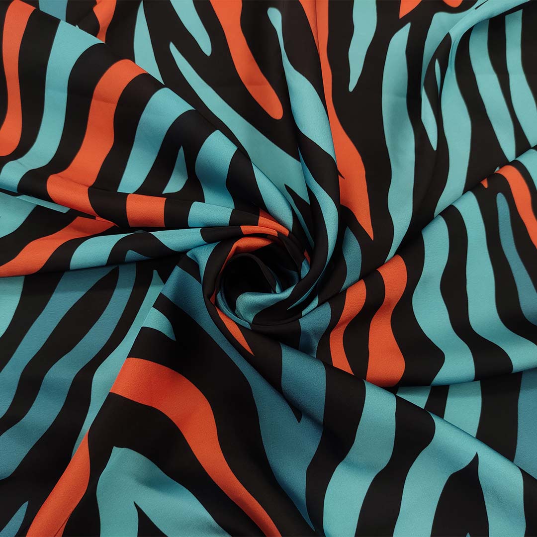Tessuto Satin a fantasia motivo animalier nero – turchese – arancio