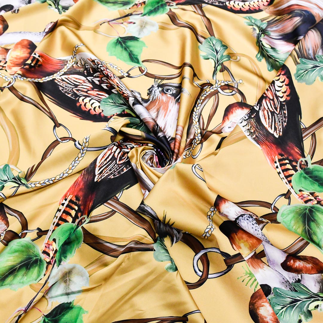 Tessuto Satin a fantasia dalla mano morbida, cadente e fluida, dall’aspetto semilucido si presta alla creazione di capi fluenti e morbidi da utilizzare in tutte le stagioni come: camicie, abiti, gonne, bluse, tute jumpsuit e pantaloni.