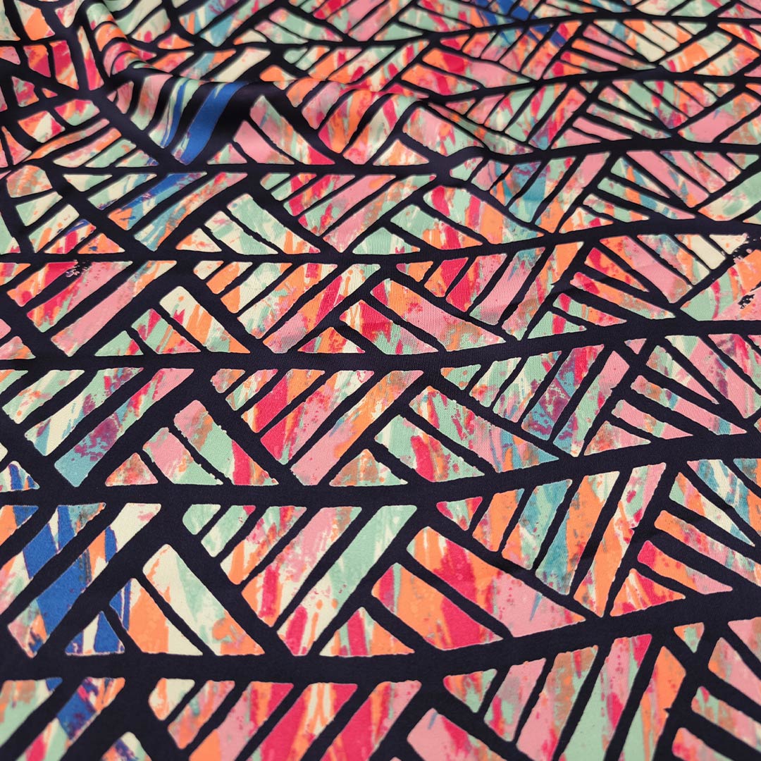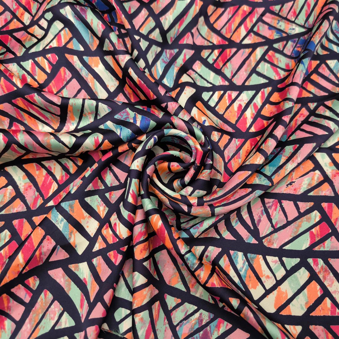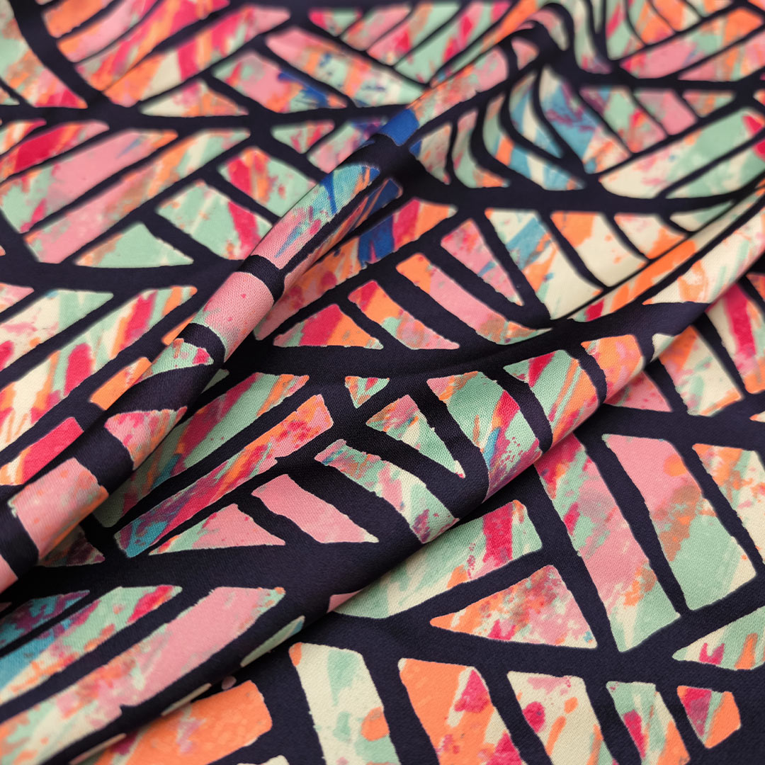 Tessuto Satin a fantasia motivo astratto blu – corallo – acquamarina