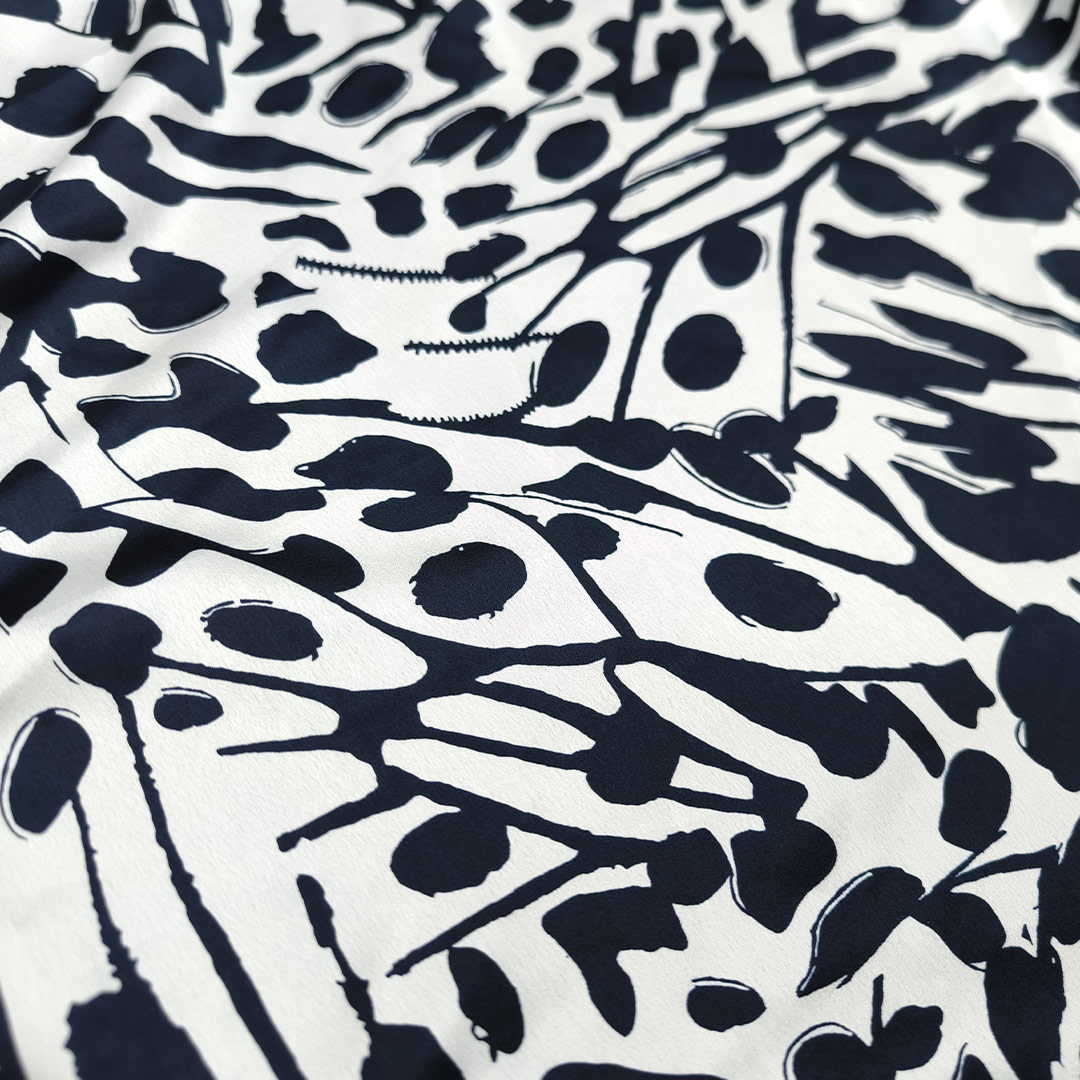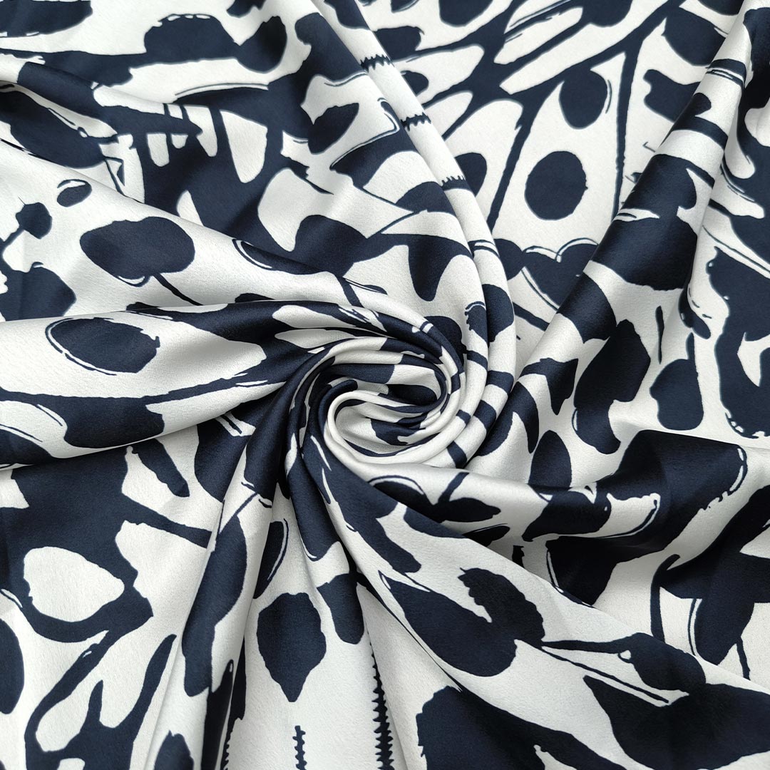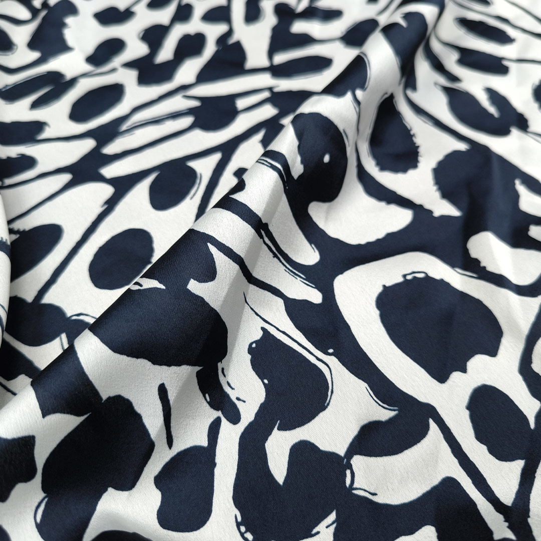 Tessuto Satin a fantasia motivo astratto blu navy – bianco