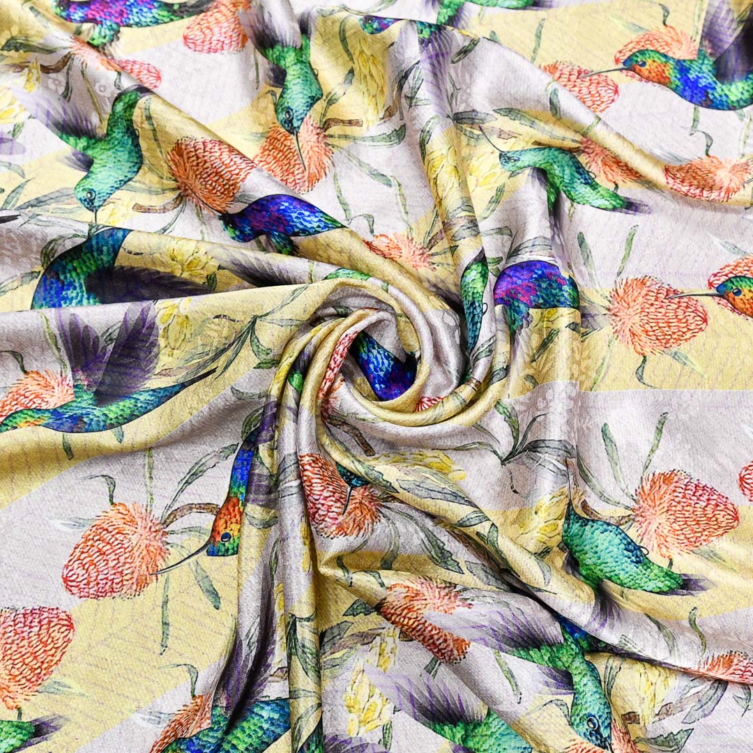 Tessuto Satin a fantasia motivo astratto giallo – beige – verde – blu