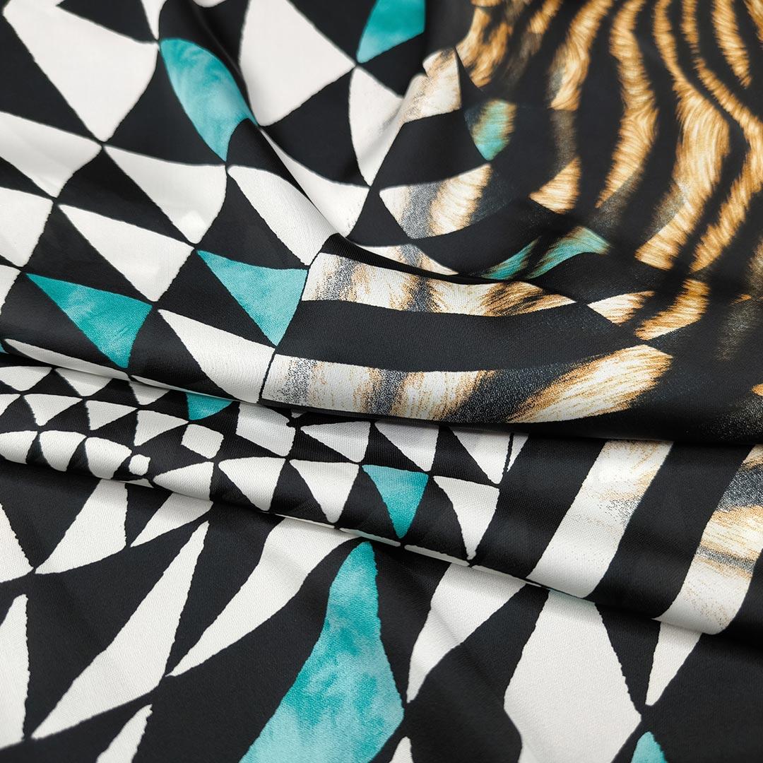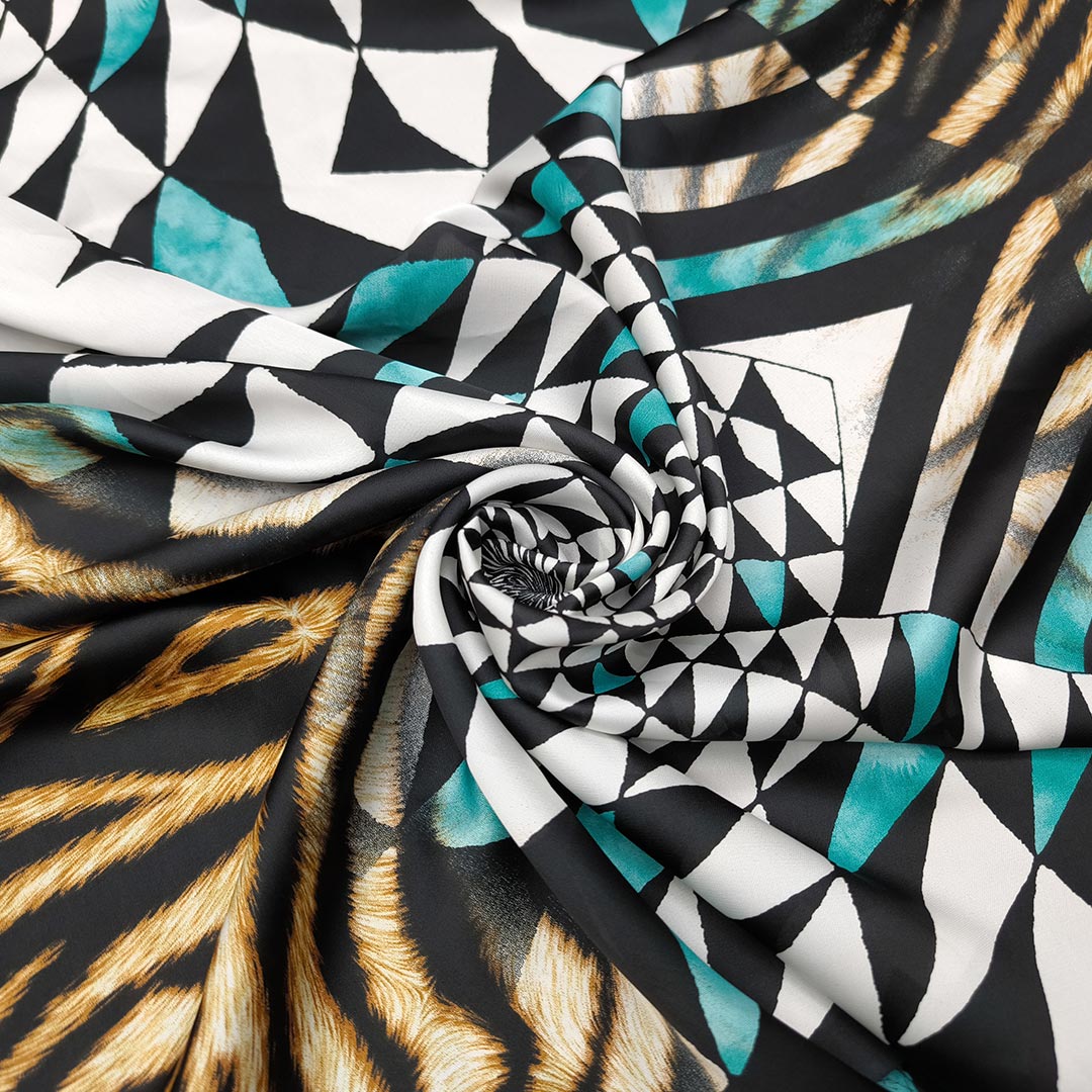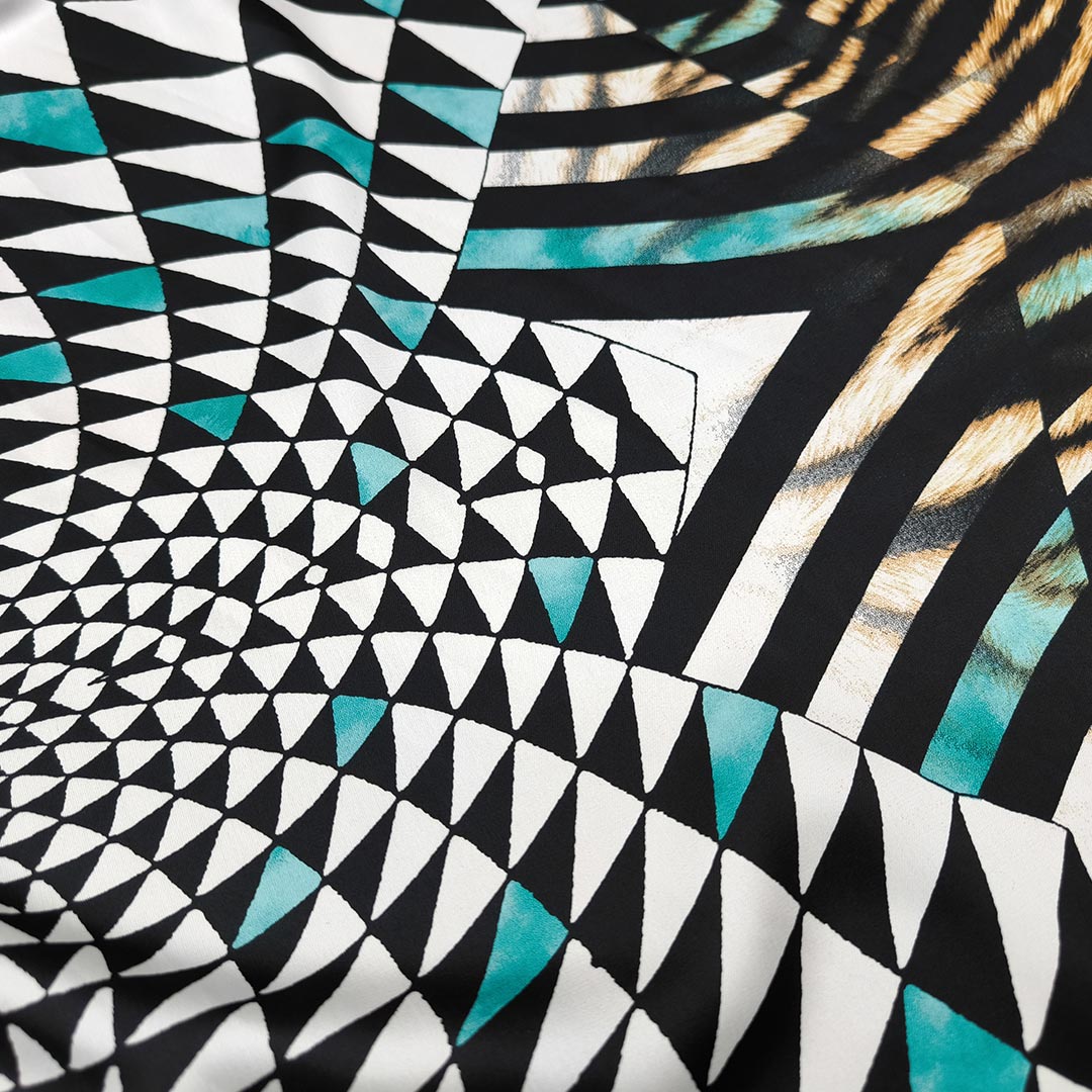 Tessuto Satin a fantasia motivo astratto nero – bianco – tiffany